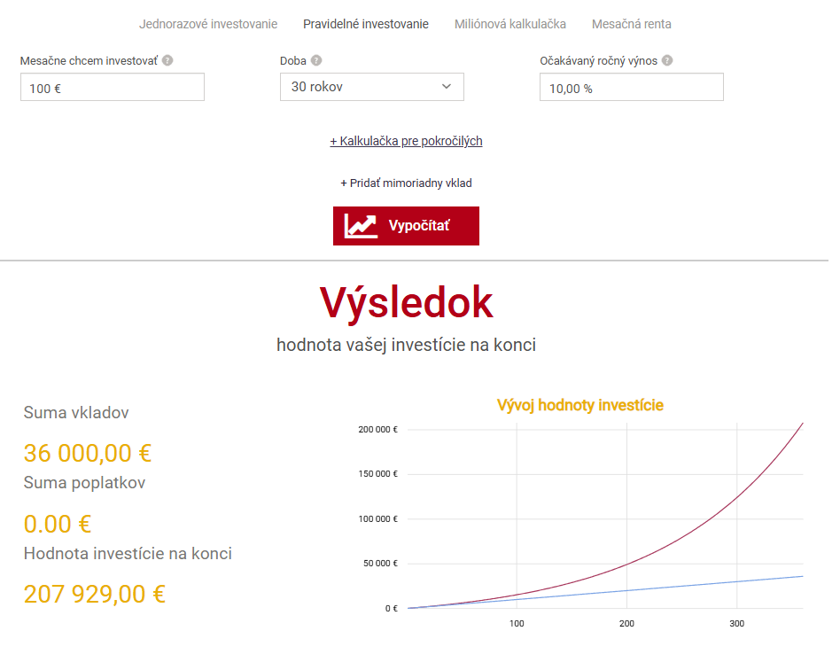 DCA je efektívne najmä pri dlhodobom investovaní, kde sa prejavuje sila zloženého úročenia. Ak reinvestujete zisky, každý ďalší výnos sa vypočítava nielen z pôvodného kapitálu, ale aj z predchádzajúcich výnosov. Dlhodobé používanie DCA tak môže výrazne zvýšiť hodnotu investície. Na obrázku nižšie je príklad na pravidelnú investíciu 100 eur mesačne po dobu 30 rokov s ročným výnosom 10 %.