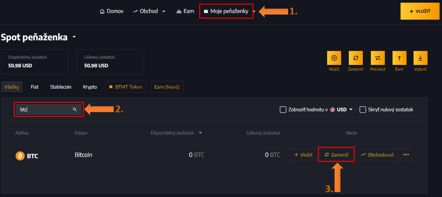 Okrem burzového rozhrania viete využiť aj zmenáreň BITmarkets, ktorá je užívateľsky priaznivejšia. Stačí si vybrať kryptomenu kliknúť na zameniť a hneď sa na vašu peňaženku pripíše objem danej kryptomeny.