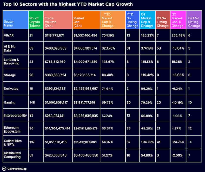 Najmä sektor VR/AR zaznamenal najväčší nárast trhovej kapitalizácie až o 704 % v prvej polovici roku 2023. Umelá inteligencia vytvorila nárast v hodnote 323 % za rovnaké časové obdobie. O niečo menej rástol sektor decentralizovaných financií (DeFi) s nárastom pôžičiek o 149 %.
