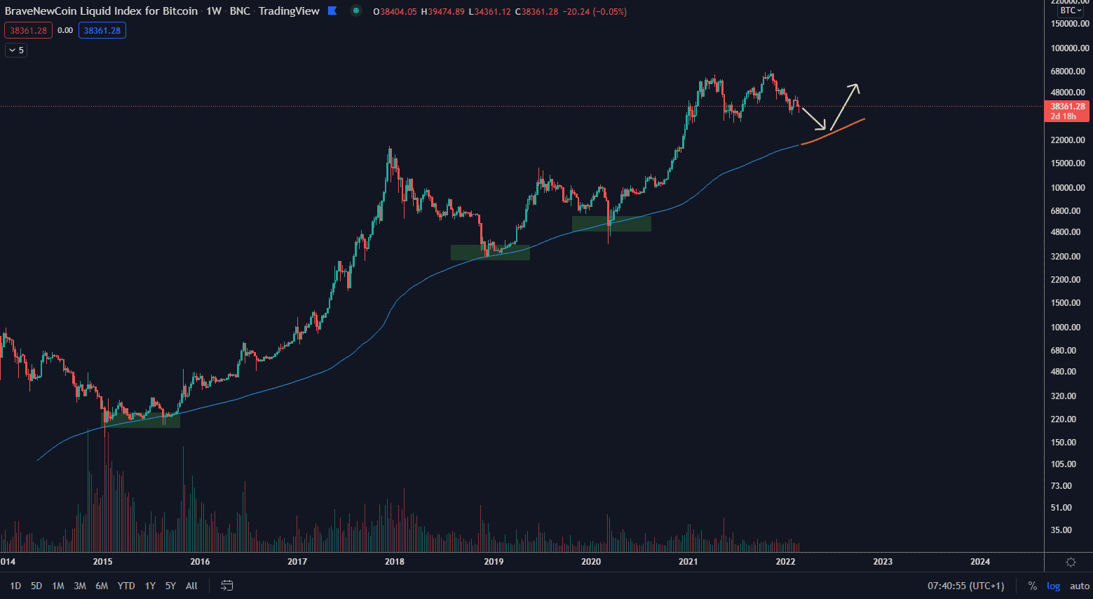 Graf nižšie zobrazuje modrú krivku MA200 na týždennom grafe. Ide o indikátor, ktorý zatiaľ stále počas svojej existencie predstavoval absolútne dno dlhodobých korekcií. Stalo sa tak v lete 2015, zime 2019 a marci 2020. Podobný scenár môže nastať aj pri súčasnom vývoji ceny.