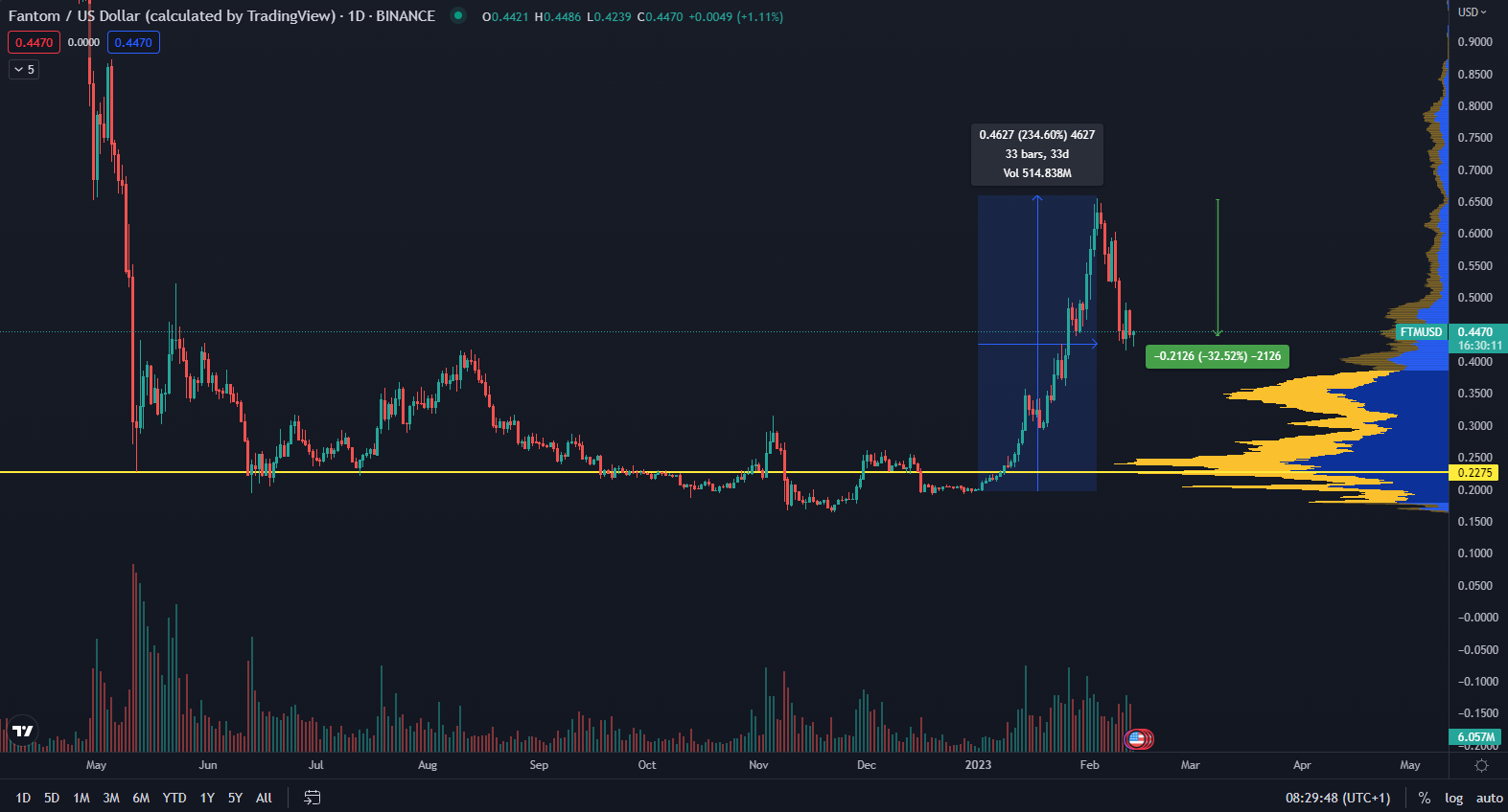 Údaje z TradingView poskytujú pohľad na súčasnú trhovú cenu FTM. Ako vidíme na grafe, fantom počas januára narástol o približne 235 % a cena následne sformovala korekciu, ktorá v čase písania článku dosahuje 32,50 %. Práve prebiehajúci pokles by mohol byť príležitosťou pre investorov, aby nahromadili ďalšie mince.