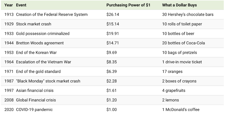 Je všeobecne známe, že meny ako dolár alebo euro z dlhodobého hľadiska prostredníctvom inflácie strácajú hodnotu. Podľa správy Coinspress americký dolár stratil od roku 1971 až 98 % kúpyschopnosti. Aj keď väčšinou je terčom tejto témy výhradne americká mena, ani zďaleka sa to netýka iba jej.