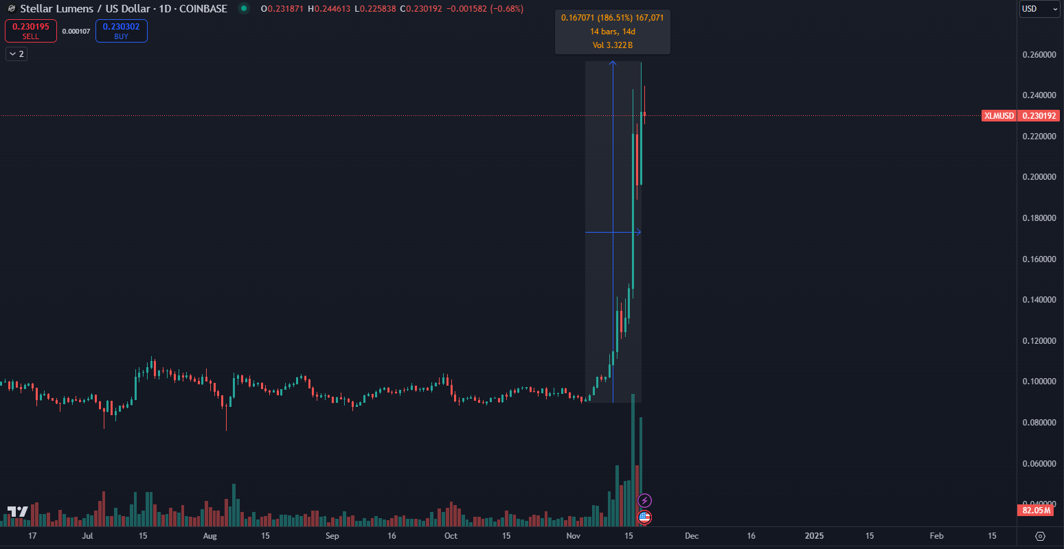 Naposledy XLM zaznamenal rastúci trend v podobnej sile na prelome rokov 2020 a 2021. Vtedy dokonca stúpol o 1 000 % len za 200 dní. V tomto cykle o obchodovanie až taký záujem nebol, keďže XLM výrazne za konkurentmi zaostával a cena bola nízko volatilná. To sa ale v novembri úplne zmenilo.