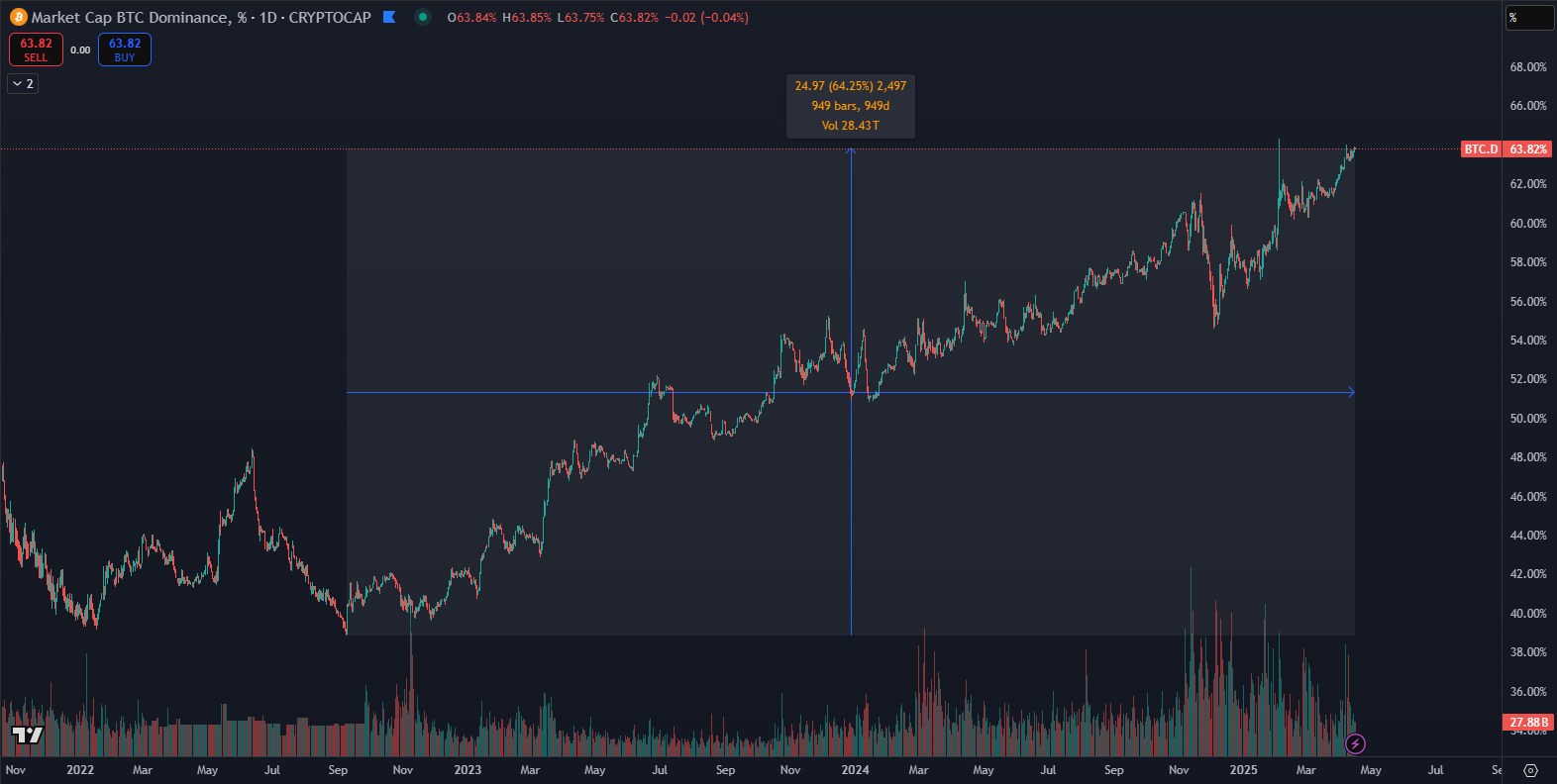 Bitcoinová dominancia vykazuje nepretržitý rast už 950 dní, čo je historicky výnimočné obdobie. Počas tohto času vzrástla z minima 39 % na viac než 63 %, čo predstavuje nárast o 64,25 %. Tento trend naznačuje, že kapitál sa sústreďuje prevažne do Bitcoinu, pričom altcoiny nedokážu zaujať investorov. Dominancia je aktuálne na viac než 4-ročnom maxime, čo odráža silnú dôveru trhu v Bitcoin ako bezpečné útočisko v neistých časoch. Tento vývoj zároveň signalizuje pretrvávajúcu slabosť širšieho kryptomenového trhu, najmä mimo hlavnej meny.