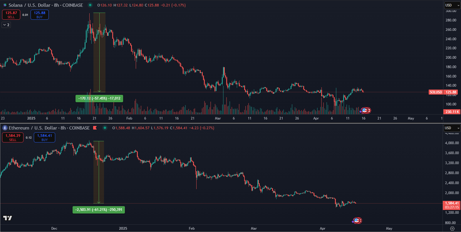 Na slabú výkonnosť altcoinového trhu má najväčší vplyv pokles trhovej kapitalizácie Etherea a Solany. Tieto dve kryptomeny historicky fungovali ako ťahúne altcoinového rastu, no v poslednom období sa výrazne odpojili od pohybu Bitcoinu.