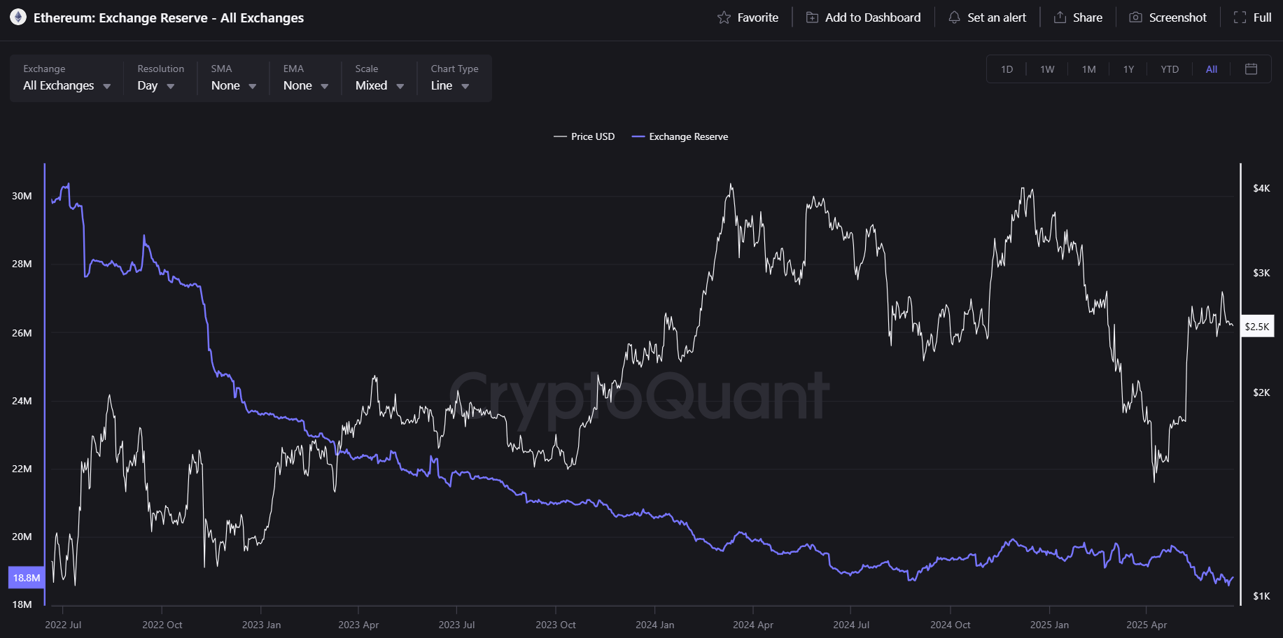 Okrem rastúceho stakingu klesá aj zásoba ETH na centralizovaných burzách, a to podľa dát z CryptoQuant. Aktuálne je na burzách iba 18,7 milióna ETH, čo je najmenej za niekoľko rokov. Tieto záporné burzové toky sú dôkazom, že viac ETH opúšťa burzy, než na nich prichádza.