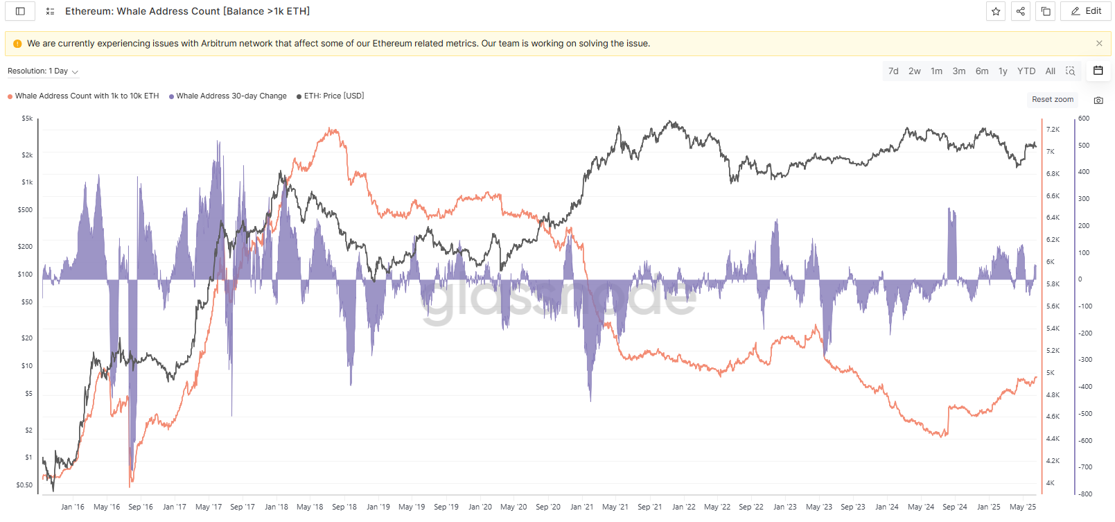 Podľa analytickej platformy Glassnode rastie počet adries, ktoré držia medzi 1 000 až 10 000 ETH. Tieto adresy už spolu kontrolujú okolo 14 miliónov ETH, čím prelomili niekoľkoročný trend poklesu. Zároveň staking prudko vzrástol, pričom viac než 35 miliónov ETH je aktuálne uzamknutých – čo predstavuje 28,3 % celkovej ponuky.