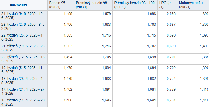 Geopolitické udalosti, ako konflikt na Blízkom východe, ovplyvňujú aj ceny pohonných hmôt na Slovensku. Aktuálne sa podľa Štatistického úradu SR predáva benzín 95 za 1,495 €/l, benzín 98 za 1,679 €/l a nafta za 1,393 €/l. V roku 2025 však celkovo sledujeme klesajúci trend cien.