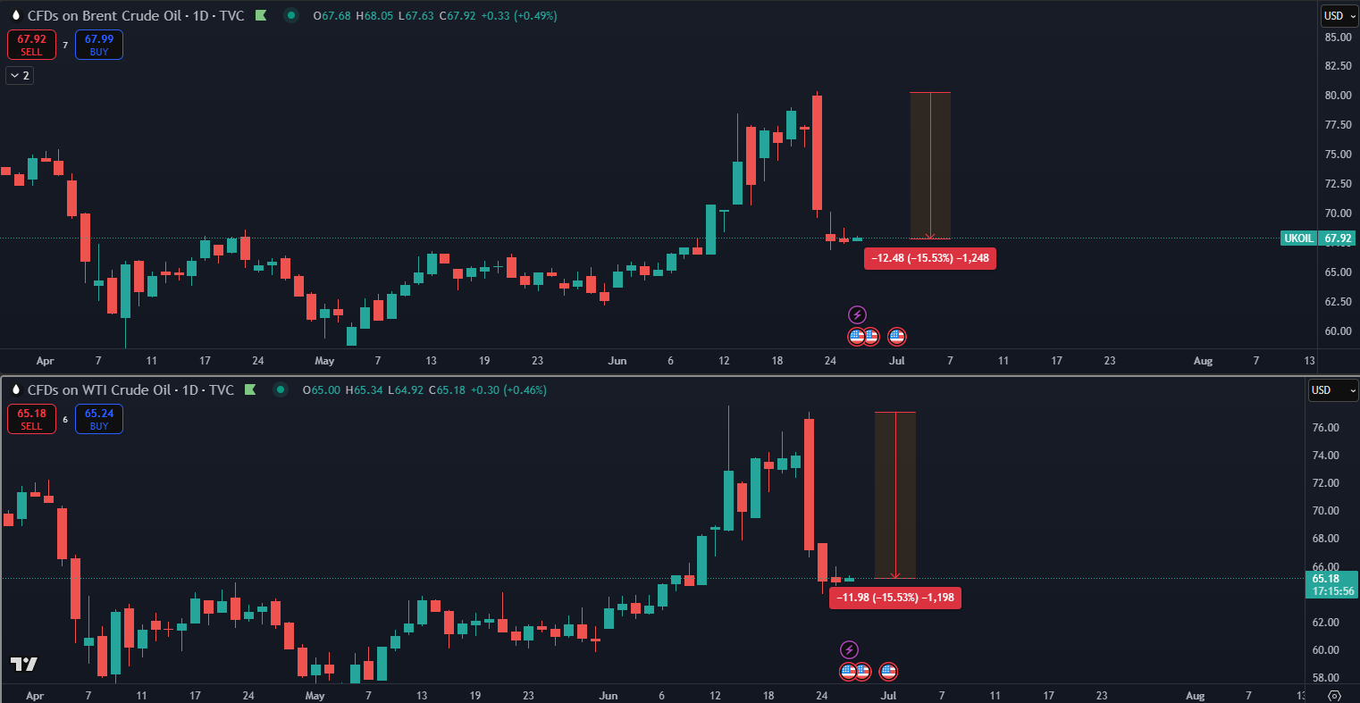 Ropa zažila v pondelok a utorok výrazný pokles cien, ktorý odzrkadľuje nádej na stabilizáciu Blízkeho východu po ohlásení prímeria medzi Iránom a Izraelom. Brent stratil od lokálneho maxima 15,53 percent a klesol na 67,91 dolára za barel, zatiaľ čo americká ropa WTI klesla o rovnaké percento na úroveň 65,18 dolára.