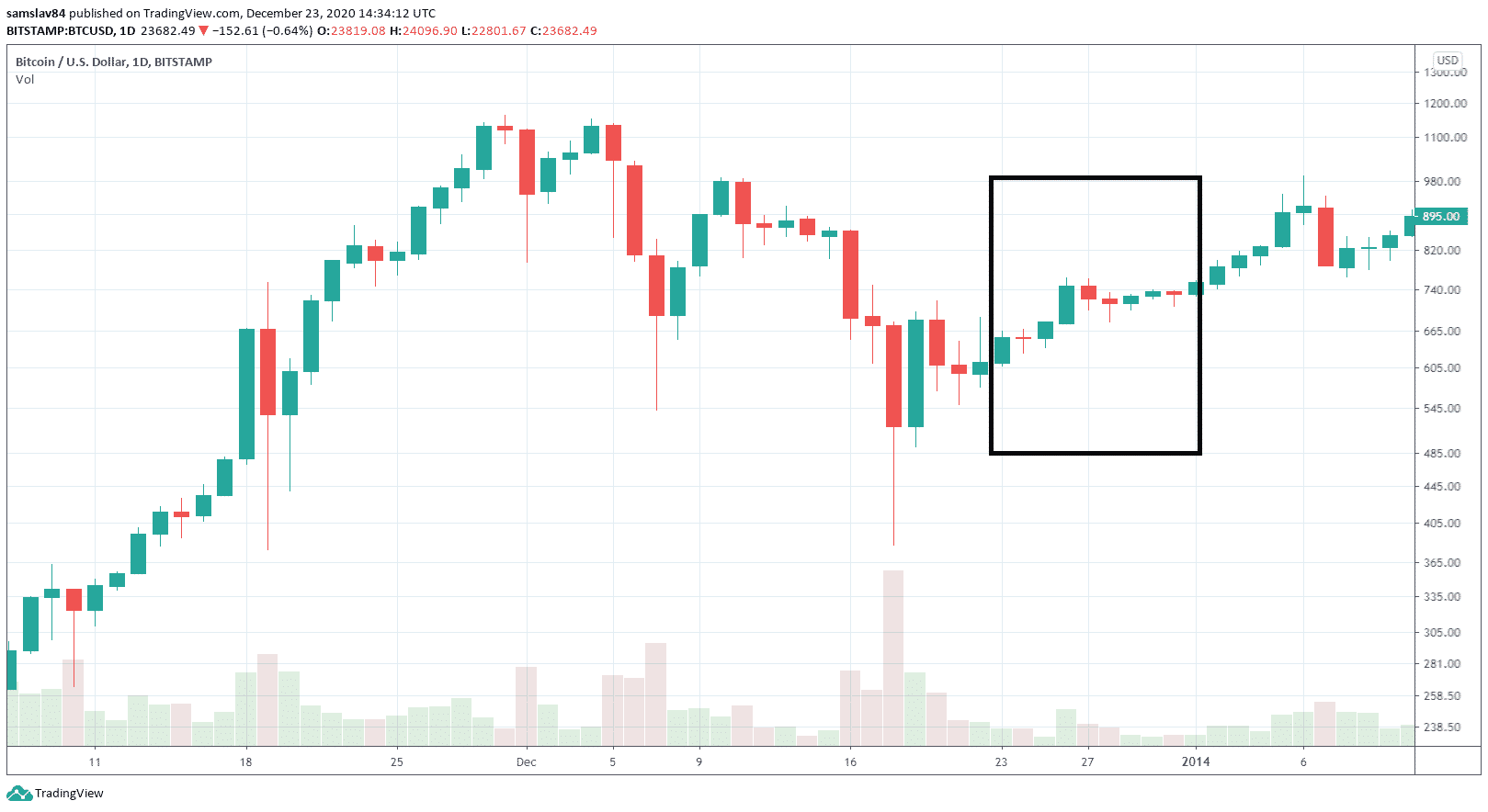 I keď, ako môžete vidieť, koncoročný prepad nie je pravidlo. Z pohybov v minulých rokoch však vyplýva, že by mohlo dôjsť ku korekcii o 3-6%. Ak sa tak naozaj stane, Bitcoin klesne na 21 000 – 22 000 $. Ešte je vhodné dodať, že na konci roka 2016 Bitcoin stúpal.