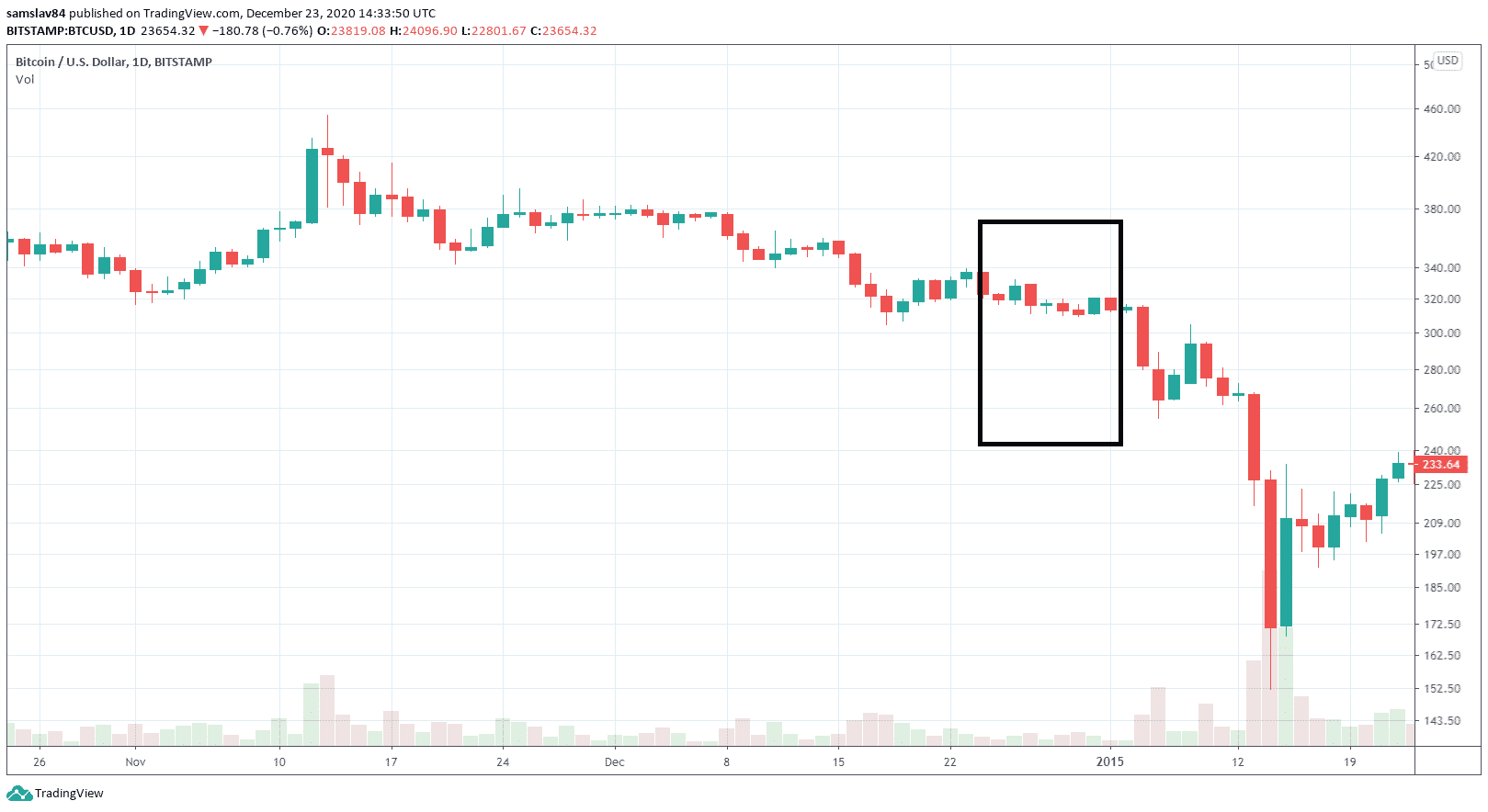 Ani história nenahráva vianočnému rastu. Stačí sa pozrieť na vývoj cien z posledných rokov a môžeme vidieť, že cena Bitcoinu zvykne koncom roka klesať. Miernu korekciu sme zaznamenali hlavne v rokoch 2017-2019.