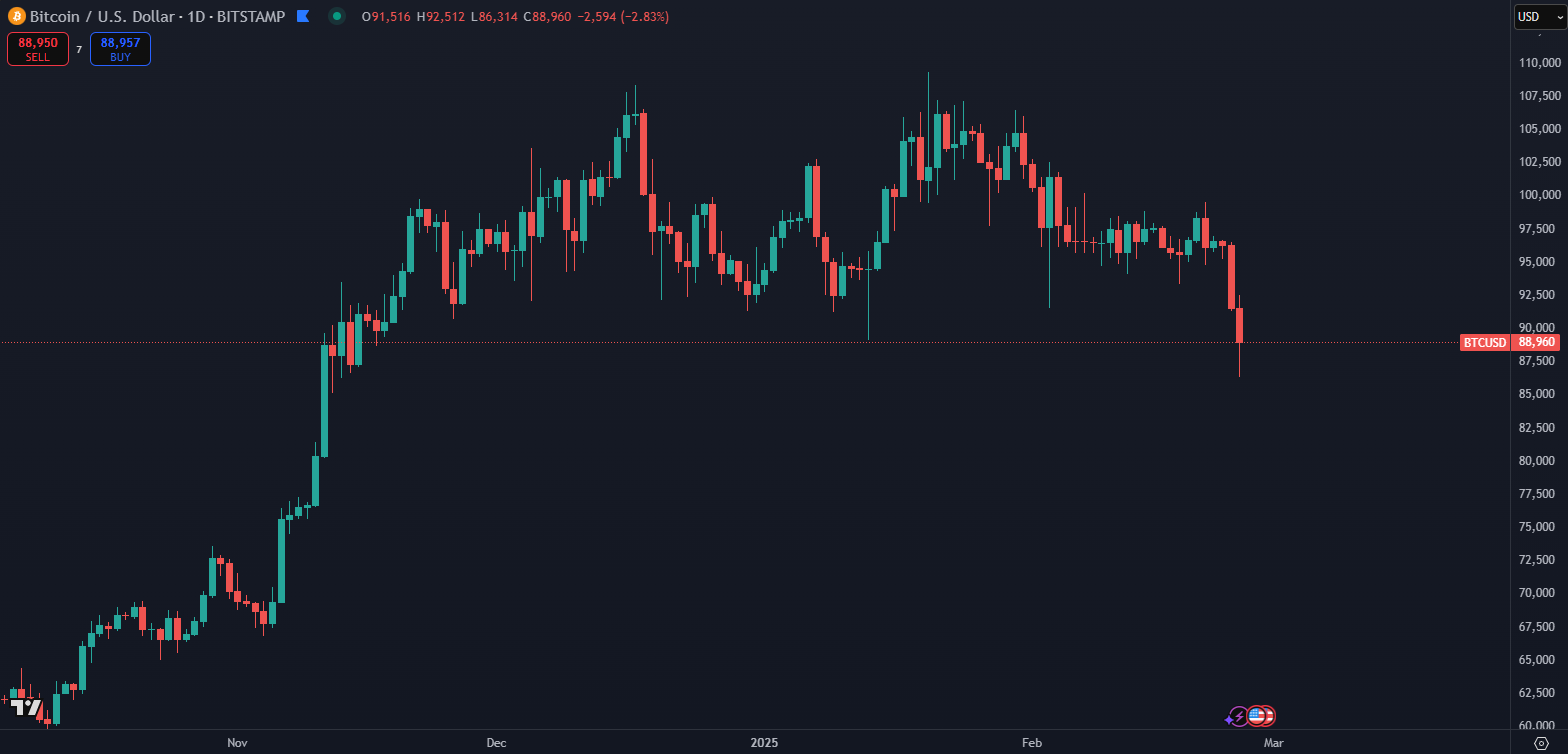 Najnovšia cena BTC je 89 000 dolárov, čo predstavuje ďalší silný pokles za posledných 24 hodín. Bitcoin sa momentálne pohybuje pod kľúčovým pásmom, ohraničenom odporom na úrovni 100 000 dolárov a podporou na úrovni 90 000 dolárov. Táto konsolidačná fáza nasledovala po jeho nedávnom ATH blízko 109 000 dolárov.
