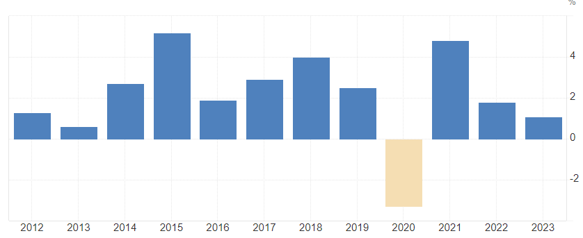 Ekonomika podľa údajov Trading Economics vzrástla v roku 2023 medziročne o 1,1 %, pričom sa spomalila z 1,8 % expanzie v roku 2022. Rast podporili zvýšené investície a kladné saldo zahraničného obchodu, aj keď bolo čiastočne kompenzované poklesom spotreby domácností.