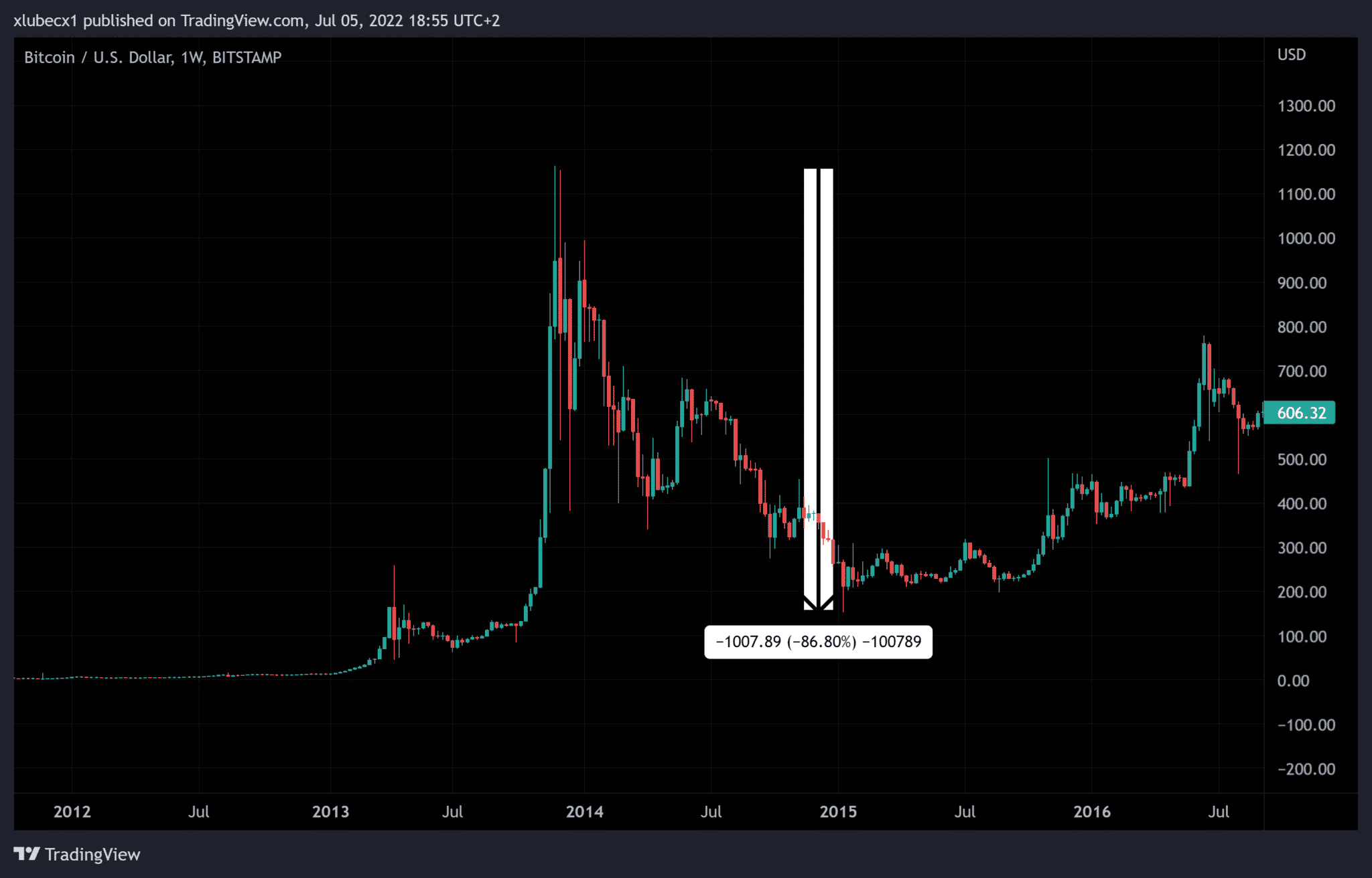V roku 2015, keď sa Bitcoin prvýkrát v histórii dostal na 1 000 dolárov, prišiel ďalší veľký pokles o 87 % a krátkodobo sa prepadol pod 200 dolárov. Tento klesajúci trend zažil iba zlomok ľudí, keďže Bitcoin začal byť celosvetovo populárny až v roku 2017. Práve počas tohto roka Bitcoin zaznamenal ďalší veľký cenový nárast.