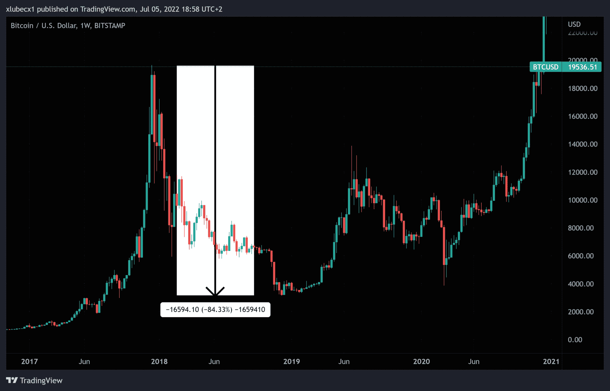 O ďalšie 4 roky neskôr prežil ďalší pokles, a to o približne 85 %, keď z 20 000 dolárov spadol na približne 3 200 dolárov. Ani veľká popularizácia či prvé vstupy veľkých fondov nezabránili ďalšiemu veľkému poklesu. Ani v tomto prípade to nebol pre Bitcoin finálny koniec. Z poklesu sa spamätal a už počas roka 2020 prekonal znovu historické maximum a ďalej rástol.