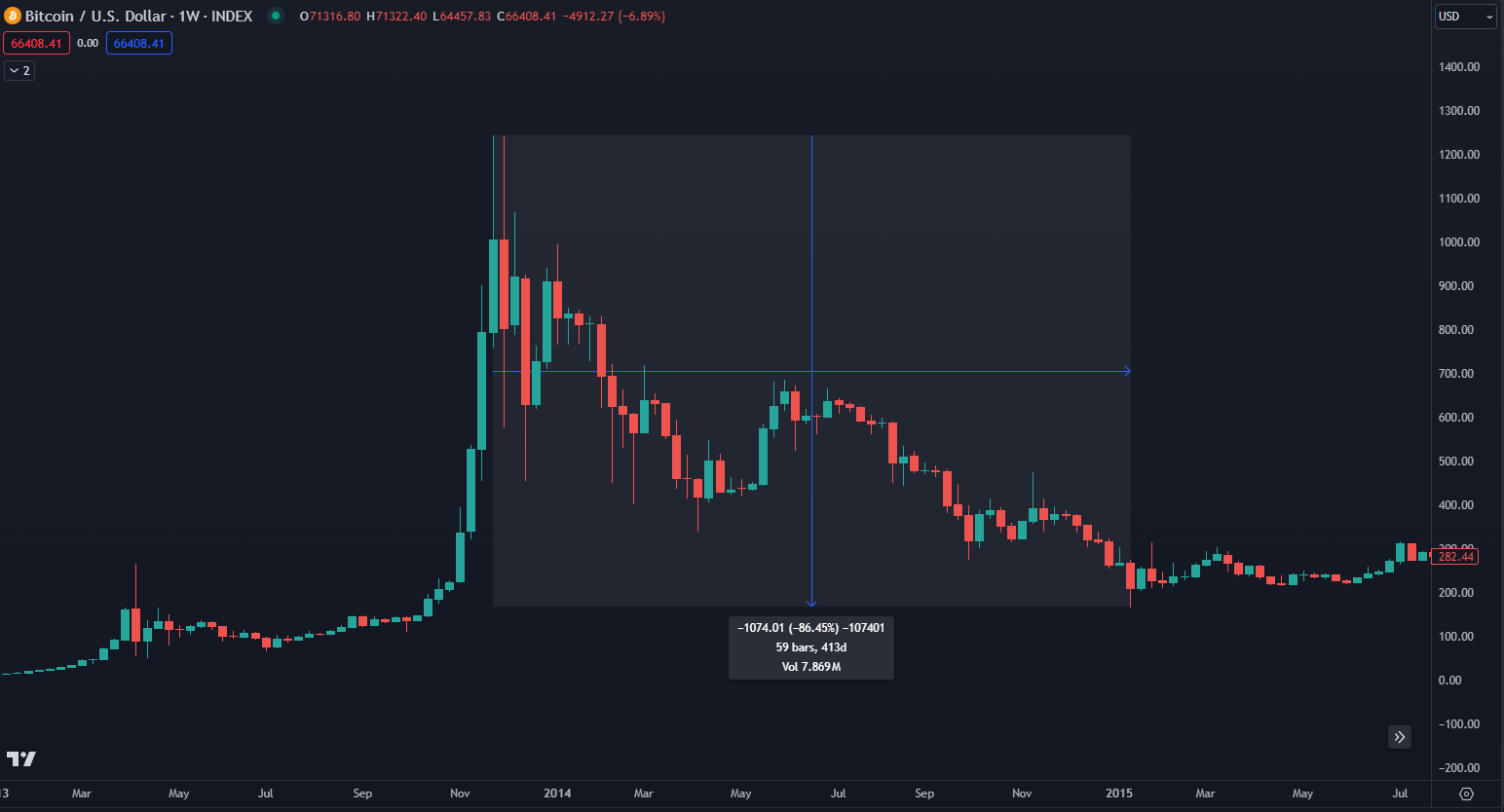 K veľkému prepadu došlo, keď bola hacknutá burza s názvom Mt. Gox, ktorá v prvých rokoch fungovania trhu s kryptomenami spracovávala viac ako 70 % všetkých bitcoinových transakcií. Burza skolabovala v roku 2014, vyhlásila bankrot so stratou približne 850 000 BTC v hodnote niekoľkých stoviek miliónov dolárov v tom čase. Neskôr sa časť týchto Bitcoinov, približne 200 000, podarila získať späť. Bitcoin klesol z maxima 1 240 dolárov na minimum 166 dolárov. Korekcia spôsobila obrovské straty.