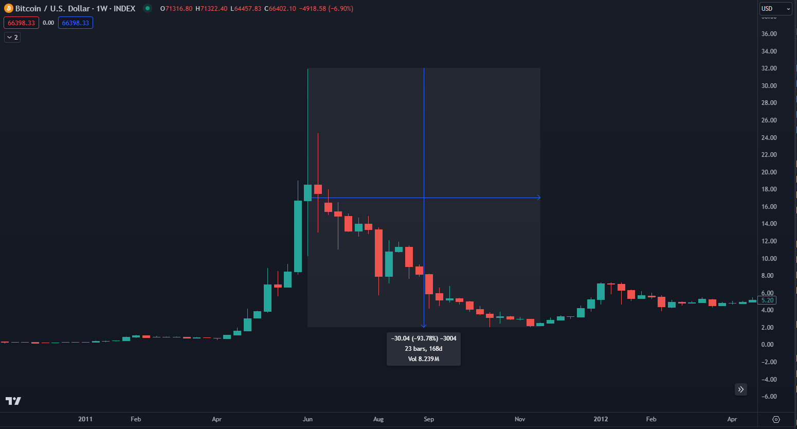 Najväčší prepad Bitcoinu aký sme od jeho vzniku až po súčasnosť mohli vidieť, je korekcia, ktorá trvala od júna po november 2011. Táto korekcia bola omnoho kratšia ako tie, čo po nej nasledovali, ale zároveň bola volatilnejšia, keďže hovoríme o prepade až 93 %. Niet sa čomu čudovať, keďže Bitcoin pred týmto poklesom stúpol o neuveriteľných 5 000 % len za 2 mesiace.
