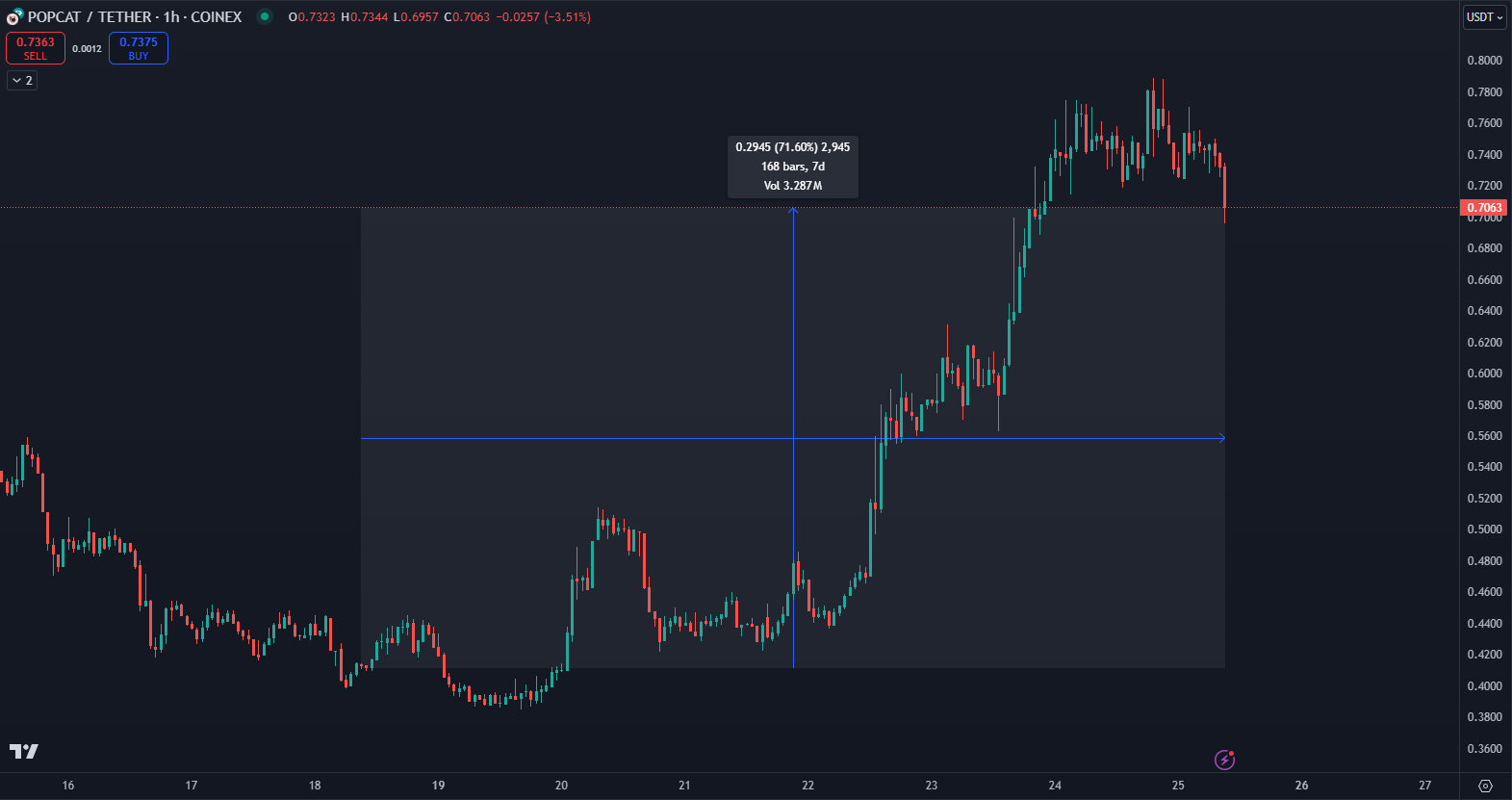 POPCAT je 89. najväčšia kryptomena na svete podľa trhovej kapitalizácie s celkovou hodnotou 703,81 milióna dolárov a denným objemom obchodovania na úrovni 93,21 milióna dolárov, čo predstavuje 13,21 % z celkovej kapitalizácie.