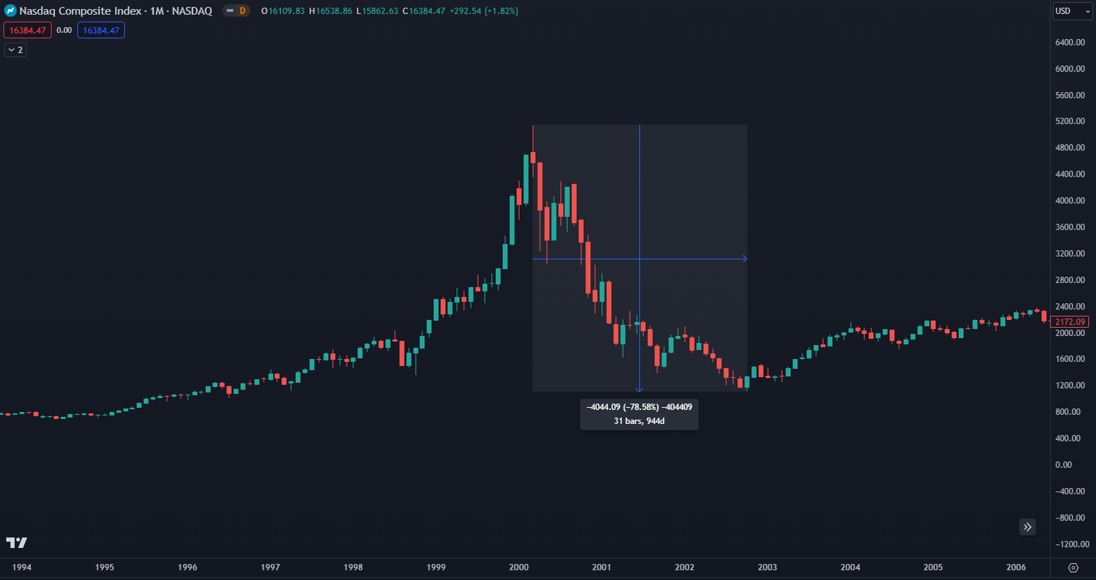 Ide o pomerne mladú bublinu. Po 10-násobnom zvýšení cien od roku 1990 dosiahol Nasdaq vrchol v marci 2000 s trhovou kapitalizáciou 6,6 bilióna dolárov. Z tejto sumy bolo vymazaných až 5,1 bilióna dolárov. Popularita internetu v 90. rokoch spustila masívnu vlnu špekulácií. Stovky technologických firiem po vstupe na burzu dosahovali miliardové zhodnotenia.