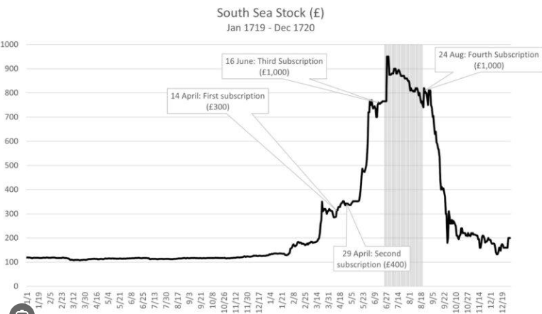 Hneď na to sa začali šíriť zvesti o tom, že v Južnom mori je nepredstaviteľné bohatstvo. Akcie firmy vzrástli v roku 1720 viac ako osemnásobne, zo 125 libier v januári na 950 libier v júli. Bublina nemala veľký hospodársky dopad, no vďaka extrémnemu rastu cien sa zaradila medzi najväčšie bubliny v histórii.