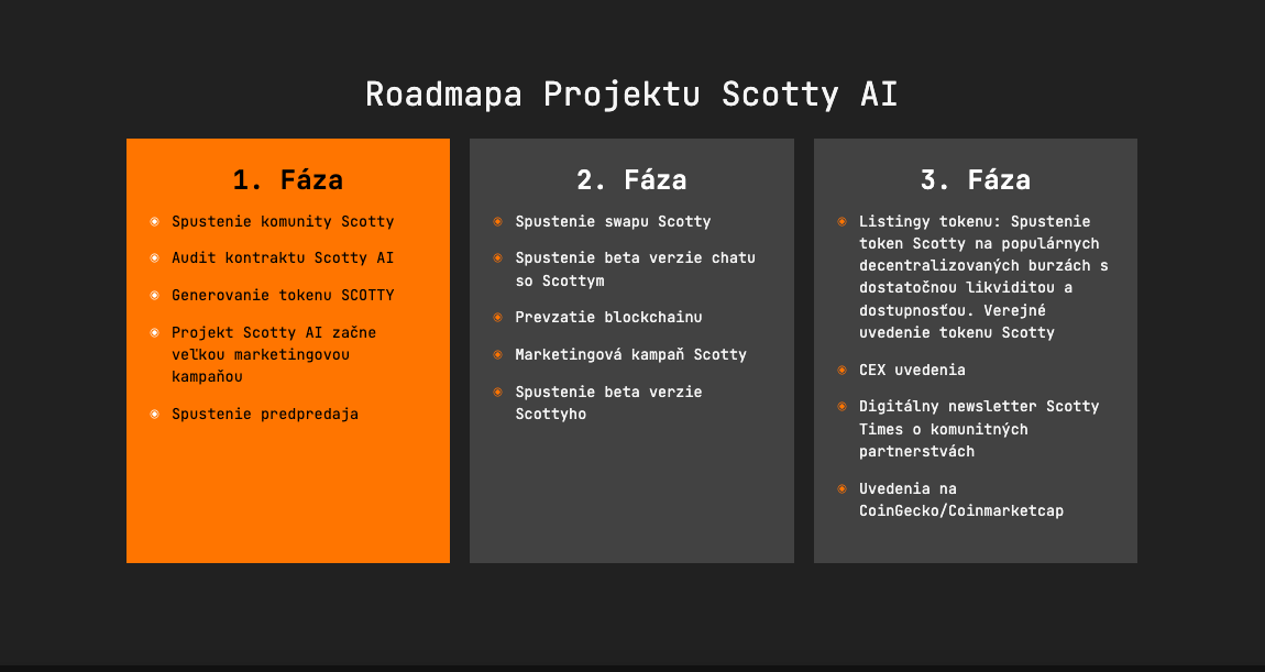 V ďalšej fáze vývoja plánuje spustiť ekosystém na swap kryptomien, ScottySwap. Ten vám v reálnom čase poskytne aktuálny prepočet hodnoty zamieňaných kryptomien, aby ste sa mohli rozhodnúť, ktorý swap bude pre vás najvýhodnejší. Zároveň pre členov komunity projekt spustí AI chatbota. V ňom Scotty the AI využije nadobudnuté znalosti z blockchainu, aby majiteľom tokenu SCOTTY odpovedal na každú otázku zo sféry DeFi.