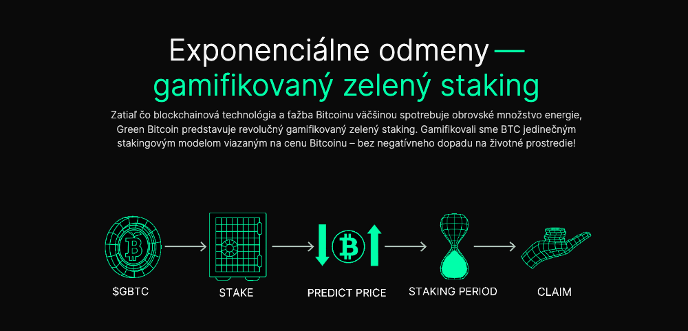 Token GBTC síce beží na blockchaine Ethereum, no svojou podstatou je priamo naviazaný na najhodnotnejšiu kryptomenu. Investorom ponúka lákavý gamifikovaný staking, ktorý tvorcovia nazvali „stake-to-predict”. Ako už z názvu vyplýva, podstatou bude predikovať spomínaný vývoj ceny Bitcoinu. Platforma funguje tak, že najskôr musia majitelia GBTC tokeny uzamknúť a následne čo najpresnejšie určiť cenu Bitcoinu pre nasledujúce obdobie.