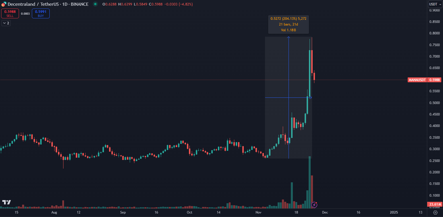 Kryptomena MANA podľa údajov TradingView stúpla za 3 týždne o 200 %. Za posledné dva dni došlo ku korekcii o 24 % a zrejme pokles ešte nezaznamenal svoj koniec. Investori by mali počkať, kým trh vychladne.