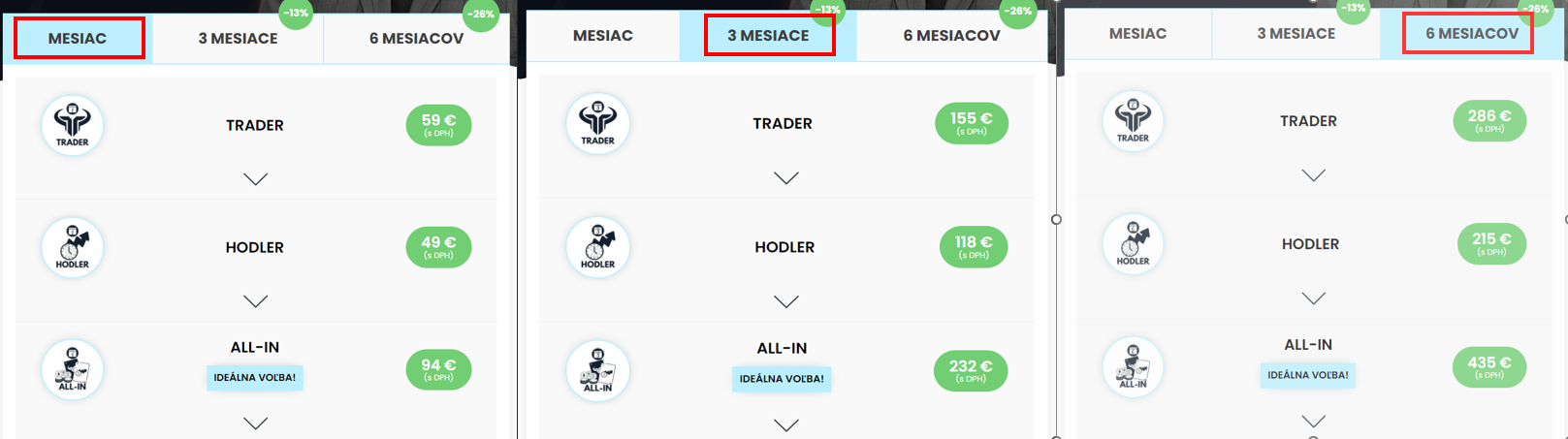 - Trader: denné signály na longy a shorty, kryptomeny na strednodobé držanie, zahraničné signály, onchain analýzy, live roomy, obchodný denník, teória vo videách a edukácia, scalping a copytrading.