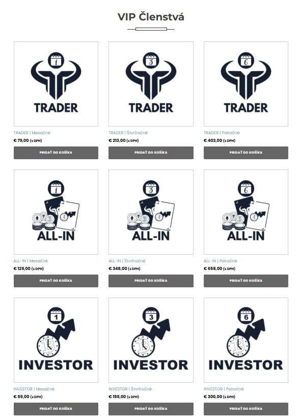 - All-in – Najkomplexnejšie členstvo kombinujúce trading aj investovanie. Poskytuje plný prístup ku všetkým nástrojom, analýzam, signálom, vzdelávaniu aj komunite. Vhodné pre investorov, ktorí chcú pokryť krátkodobé aj dlhodobé stratégie a maximalizovať príležitosti na finančných trhoch.
