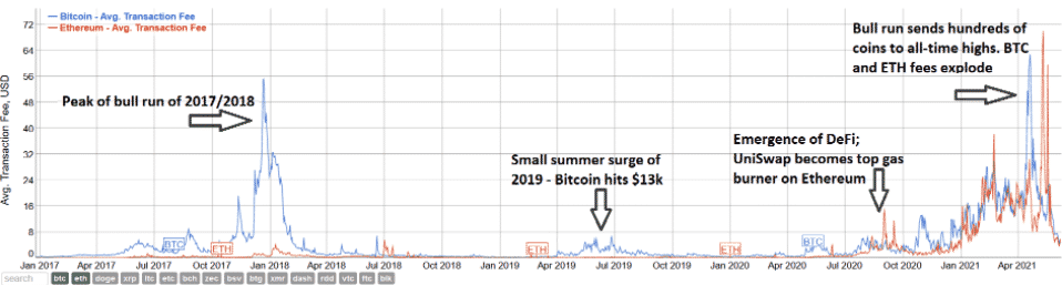 Rovnaký vzorec bol zaznamenaný aj v prípade Etherea. Priemerné transakčné poplatky 12. mája vzrástli až na 69,92 USD. Išlo o historické maximum nákladov na používanie Etherea. Nárast bol ovplyvnený aj uvedenim decentralizovaného financovania a burzy Uniswap, ktorá je dlhodobo najväčším spotrebiteľom zdrojov na ethereum.