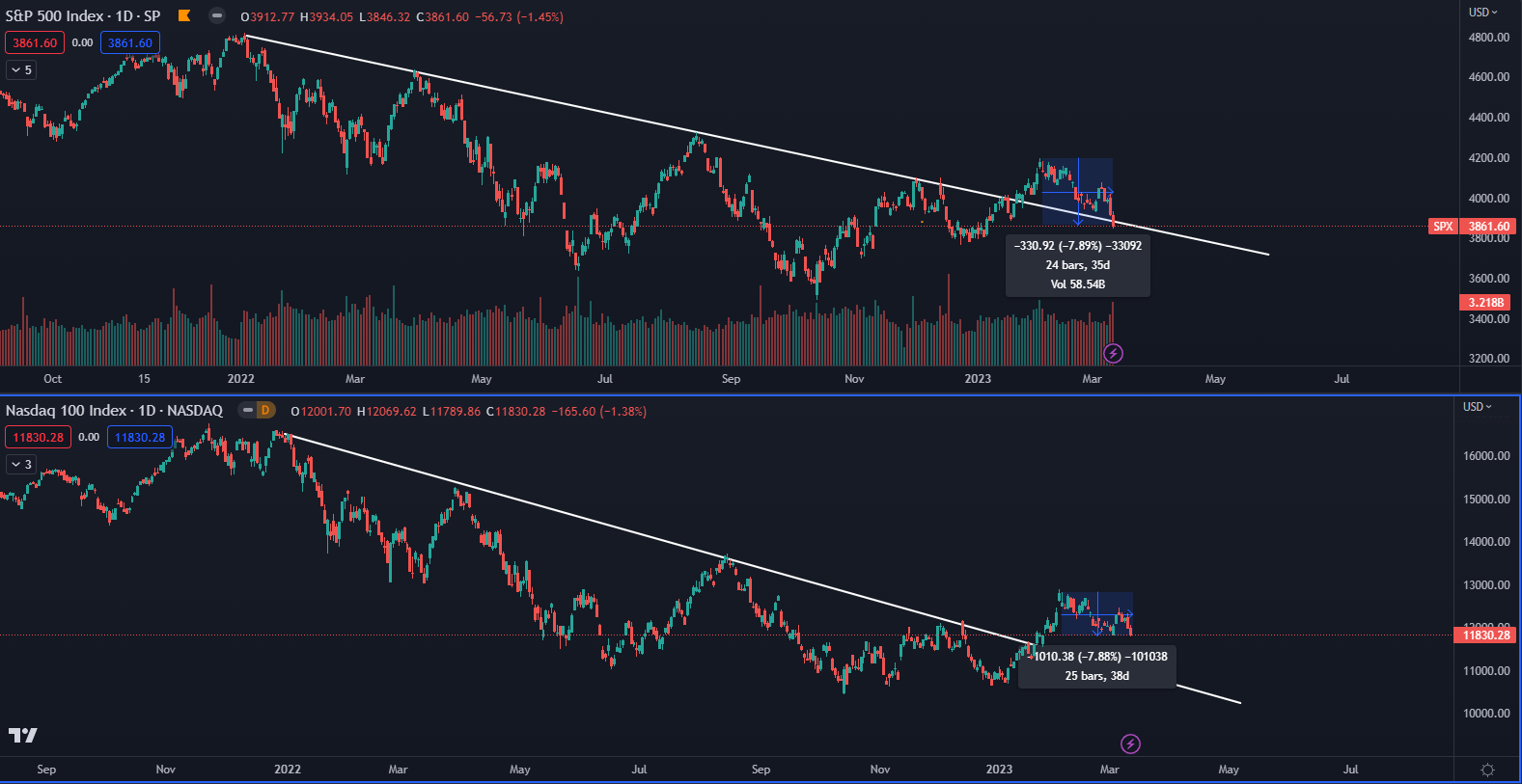 Na grafe nižšie môžete vidieť grafy indexov SPX a NDX. Po celoročnej korekcii z roku 2022 sa zdalo, že konečne dôjde k realizovaniu ziskových obchodov, no januárový rast bol okamžite sprevádzaný ďalším cenovým pádom.