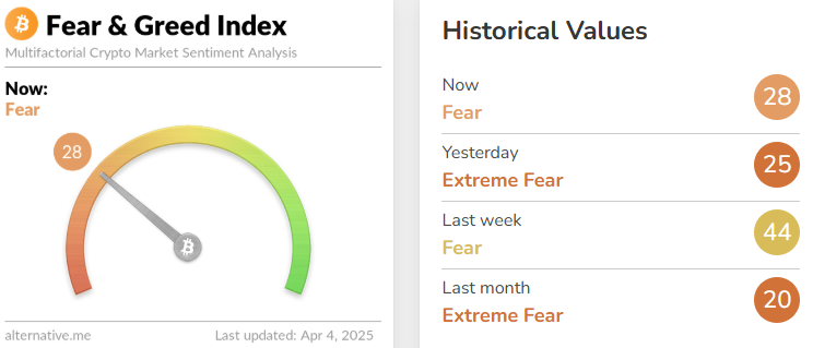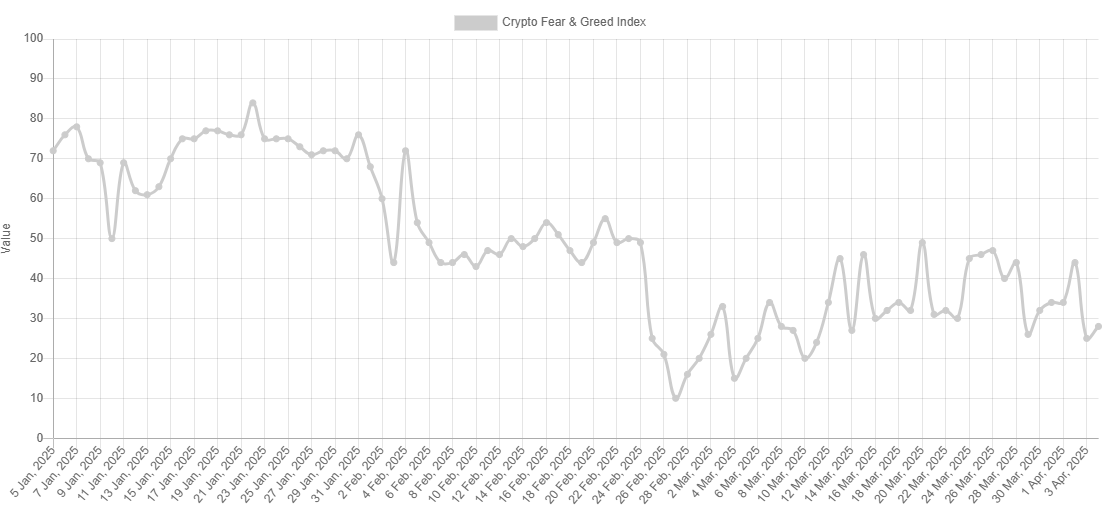Kryptomeny pokračujú v dlhodobej korekcii. Index strachu a chamtivosti kryptomien sa prepadol na hodnotu 25, čo znamená pokles o 19 bodov oproti predchádzajúcemu dňu. Trh sa tak dostal do pásma extrémneho strachu. Podľa magazínu Crypto News tento prudký pokles nasledoval po oznámení amerického prezidenta Donalda Trumpa o agresívnych nových clách.