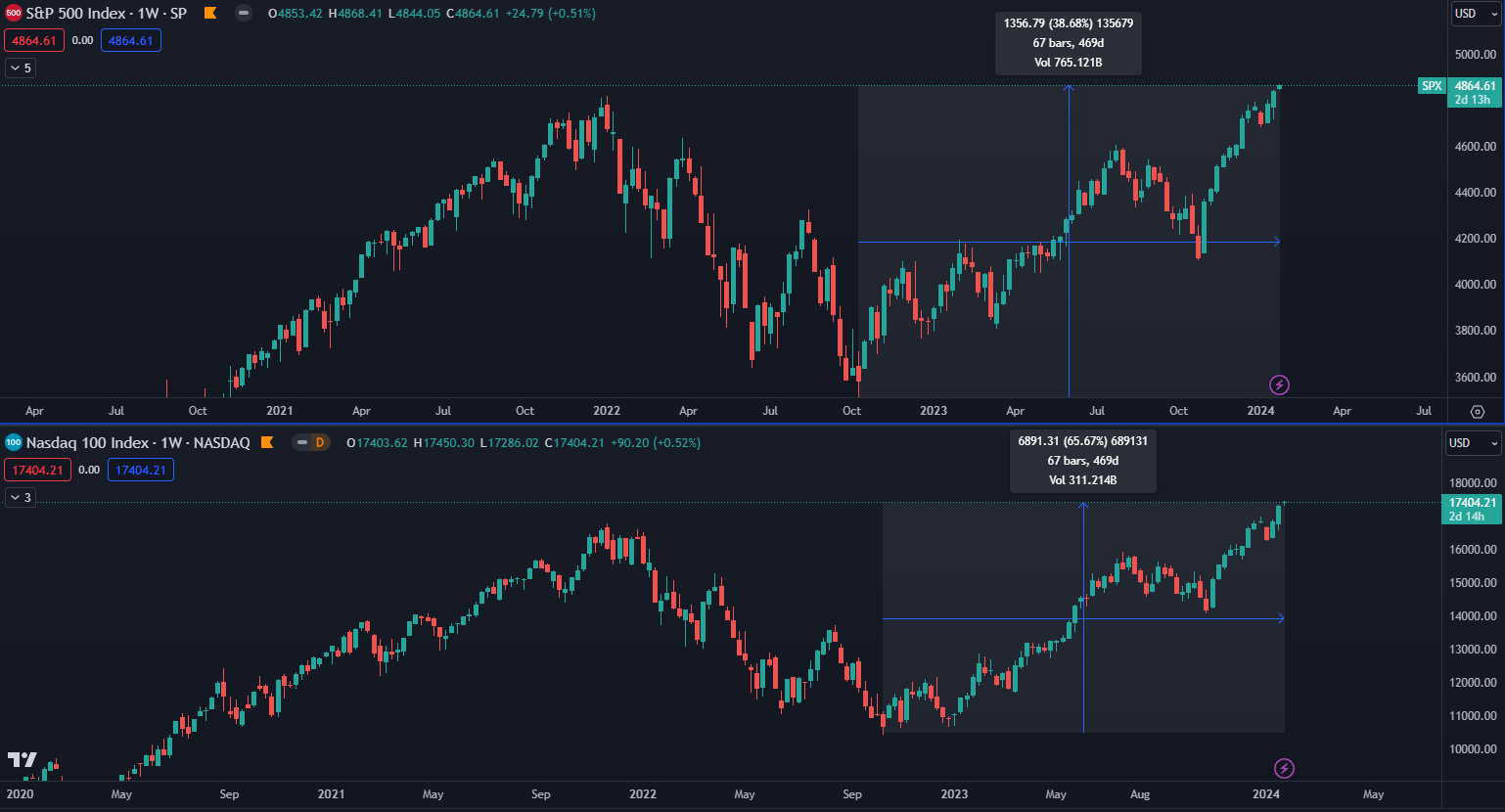 Akcie sú väčšinou reprezentované prostredníctvom indexov v USA, keďže v tomto trhu je bezkonkurenčne najviac kapitálu. A práve dva najznámejšie indexy S&P 500 (SPX) a Nasdaq (NDX) prepísali históriu a prekonali najvyššiu cenu, akú sme kedy mohli vidieť. Podľa údajov TradingView sme svedkami takmer 500-dňového rastúceho trendu.