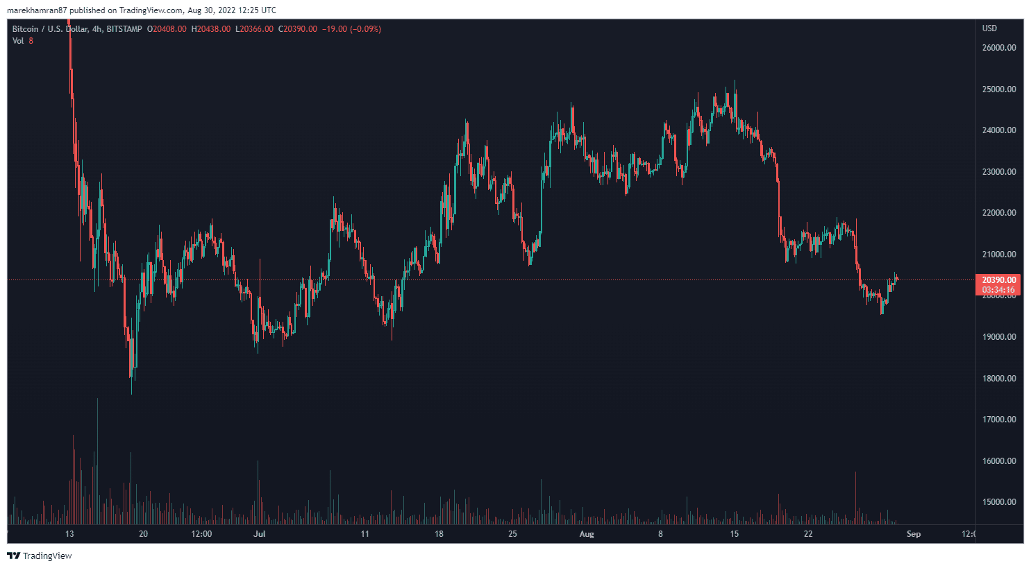 Posledné vyhlásenie predsedu Federálneho rezervného systému Jeroma Powella v Jackson Hole dňa 26. augusta vyvolalo na trhu s kryptomenami ďalší prepad. Ten sa v prípade Bitcoinu ustálil až počas víkendu na cene 19 527 dolárov. V čase písania tohto článku sa BTC úspešne dostal nad dôležitú hranicu 20 000 dolárov, a to konkrétne 20 409 dolárov.
