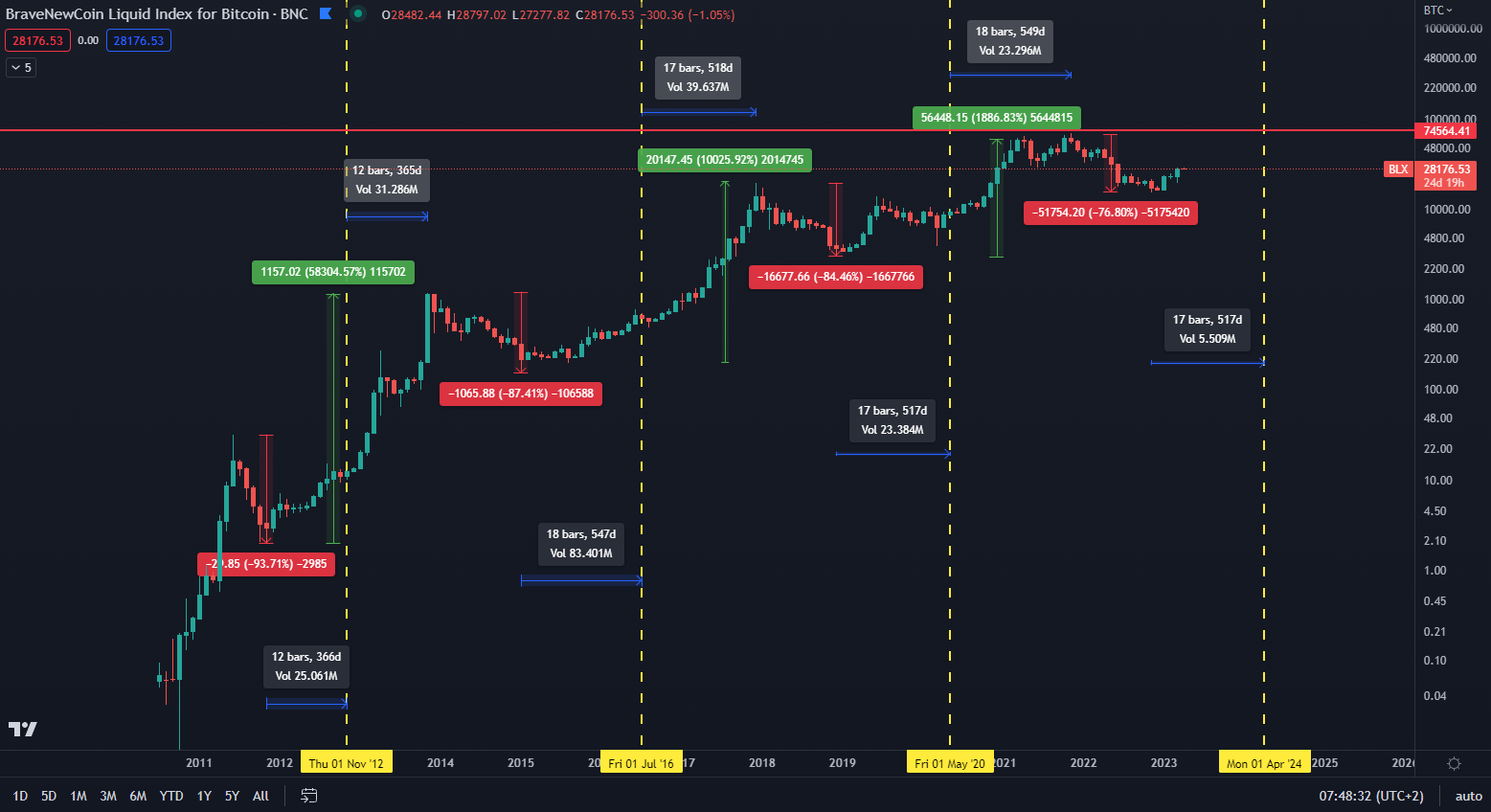 Teraz sa pozrieme na súčasný cenový vývoj bitcoinu. Podľa údajov TradingView je bitcoin v počiatočnej fáze bullrunu. Od novembrového minima až po ďalší halving je približne interval 517 dní, čo je identické s dvoma predchádzajúcimi cyklami, ako môžeme vidieť na grafe nižšie.