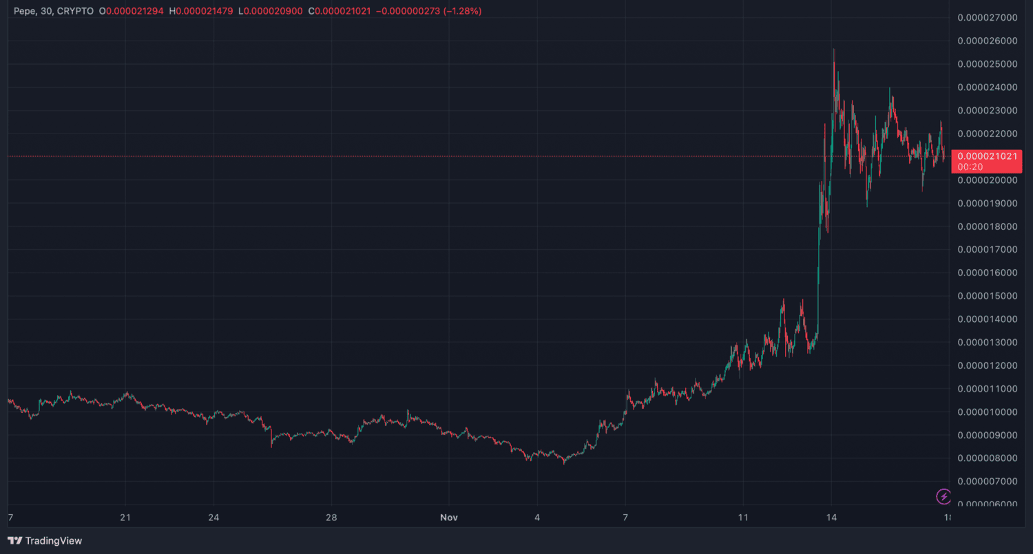 Markantný rast PEPE za posledný mesiac. Zdroj: TradingView
