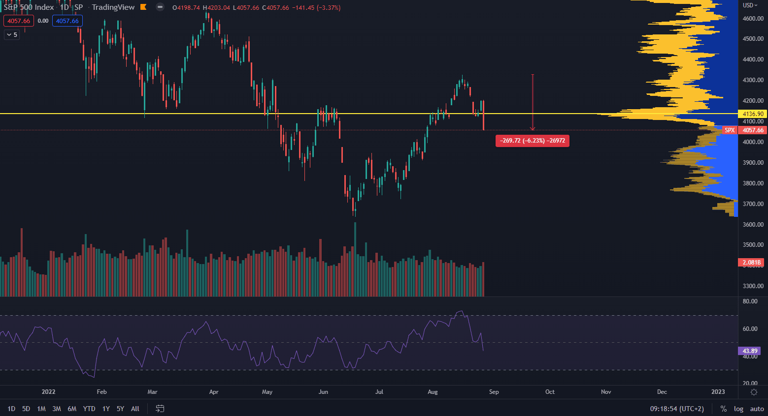 SPX sa pred víkendom prudko prepadol a aktuálne sa obchoduje dňa 29. augusta za 4 057 dolárov. Za 10 dní sa cena znehodnotila o 6 %. Bitcoin taktiež klesá posledné 2 týždne a v tomto období zaznamenal stratu hodnoty 22 %. Ani drahé kovy neboli výnimkou, pričom zlato za dva týždne stratilo takmer 5 % a striebro takmer 11 %.