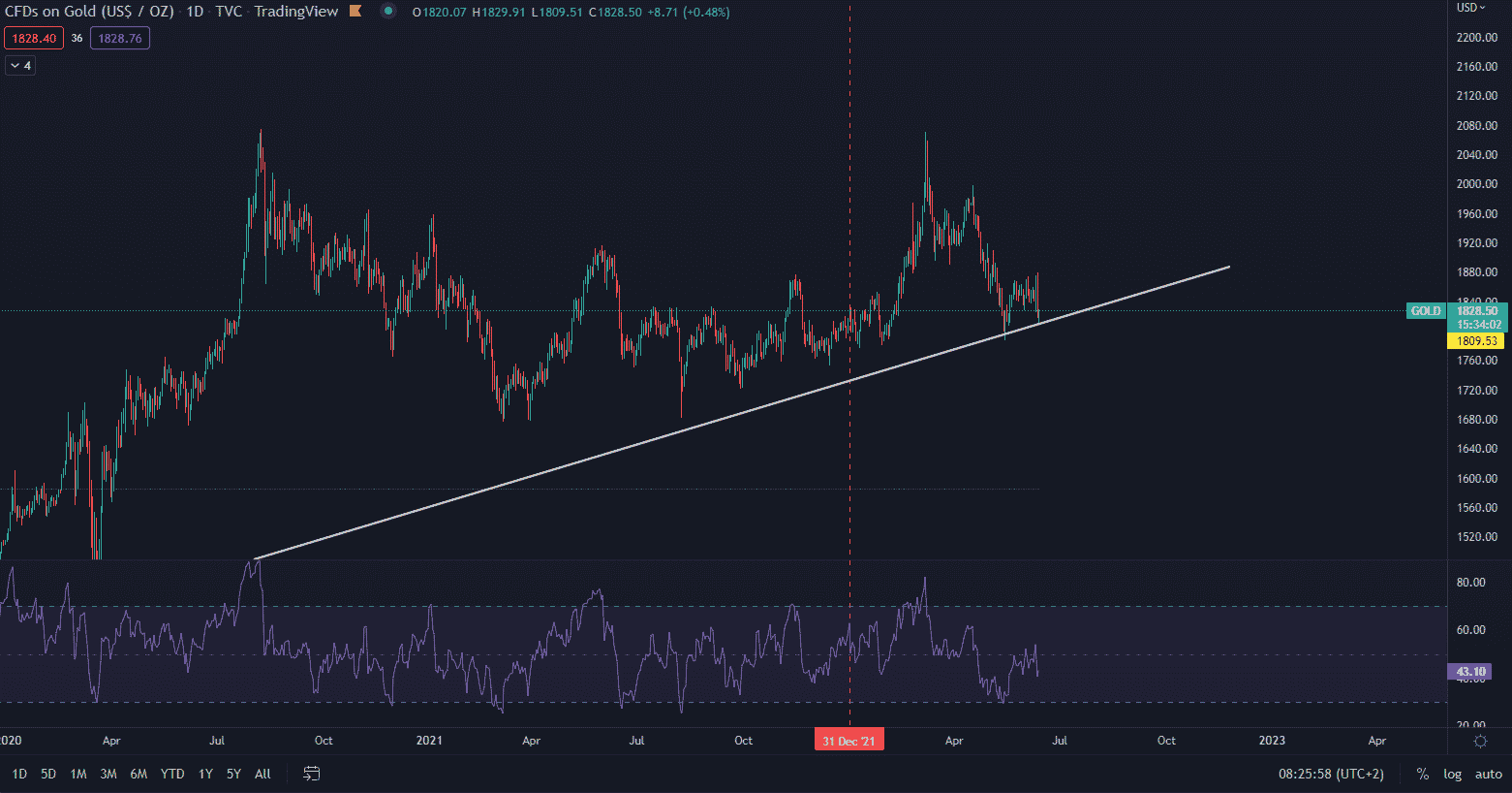 Bitcoin od 1. januára klesol už o 50 %, zatiaľ čo SPX klesol od rovnakého dátumu už o zhruba 22 %. Keď sa však pozrieme na graf nižšie, uvidíme, že cena zlata sa drží zhruba na rovnakej hodnote ako z prelomu rokov. Je potrebné brať do úvahy aj zhodnotenie dolára, ktoré reprezentuje index DXY.