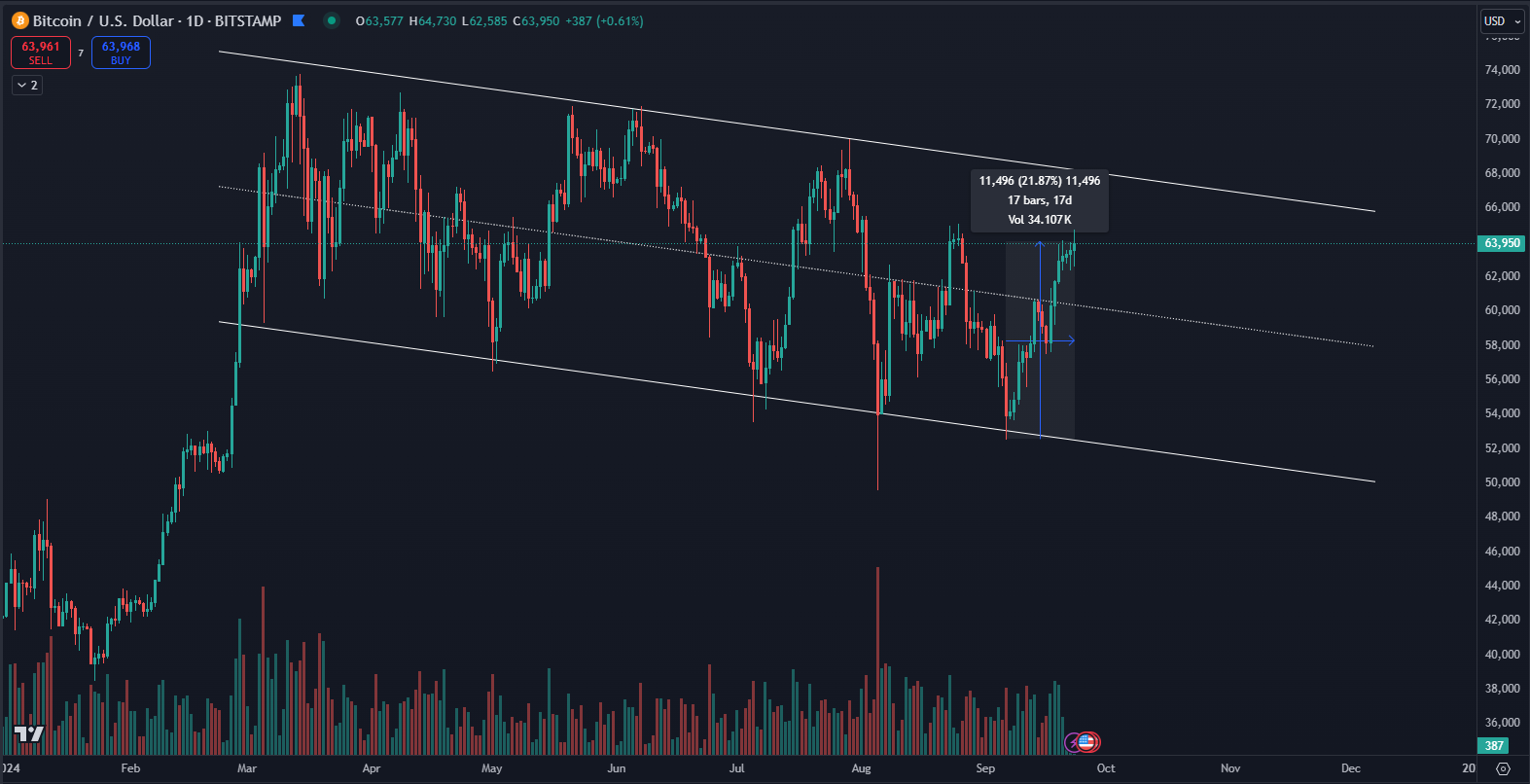 Bitcoin zatiaľ v septembri zaznamenal pozoruhodné zhodnotenie, a to aj napriek tomu, že historicky ide o najhorší mesiac v roku. Za posledných 17 dní cena najväčšej kryptomeny neustále rastie a dosiahla zisk 22 %, ukazujú údaje TradingView. Predajný tlak ustupuje a nálada investorov je čoraz pozitívnejšia.