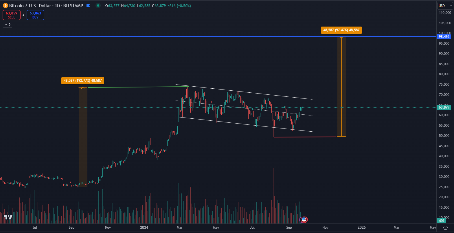 Na základe teórie by mohol Bitcoin po ukončení vzoru dosiahnuť 100 000 dolárov. Pre lepšie pochopenie, veľkosť rastu pred vzorom sa počíta od minima vzostupu po maximum vo vlajke (zelená úsečka). Naopak, potenciálny rast po vzore sa počíta od minima vo vlajke až po konkrétnu úroveň (červená úsečka), ktorú získame skopírovaním predchádzajúceho rastúceho trendu.