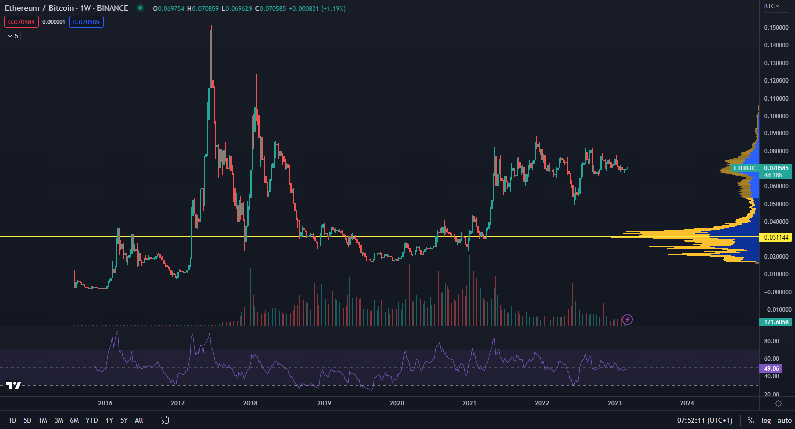 Ak sa ale pozrieme na cenový vývoj počas bullrunov zistíme, že ethereum dosahuje vyššiu ziskovosť ako bitcoin. Na grafe nižšie vidíme pár ETH/BTC, kde jasne vidieť, že rastúci cyklus kryptomien spôsobil niekoľko násobné zhodnotenie ETH voči BTC dvakrát po sebe. V prípade, že sa zaujímate aj o aktuálnu analýzu ceny etherea, odporúčame vám prečítať si článok Ethereum je časovaná bomba. Čo spôsobí jeho rast?