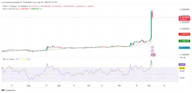 Technické indikátory odhaľujú rastový trend pre TRX, no je potrebná opatrnosť kvôli prekúpeným podmienkam. V súčasnosti je Index relatívnej sily (RSI) na hodnote 77, čo naznačuje, že TRX môže byť v krátkodobom horizonte prekúpený. RSI nad 70 typicky signalizuje, že aktívum je prekúpené a môže čeliť korekcii, keď účastníci trhu využijú zisky.