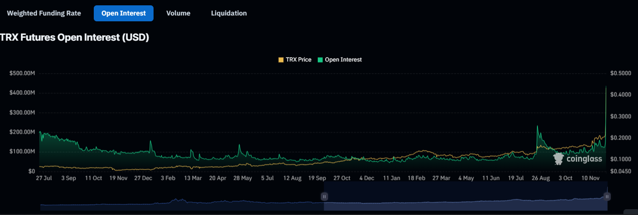K tomuto pozoruhodnému cenovému pohybu prispieva niekoľko faktorov. Inštitucionálny a retailový záujem prudko vzrástol, čo dokazuje 43 % nárast v TRX Futures Open Interest, ktorý dosiahol 184,82 milióna dolárov podľa údajov Coinglass. Navyše, jednodňový transakčný objem TRX zaznamenal významný nárast o 116 %, čo podčiarkuje silnú angažovanosť zo strany burzovej komunity.