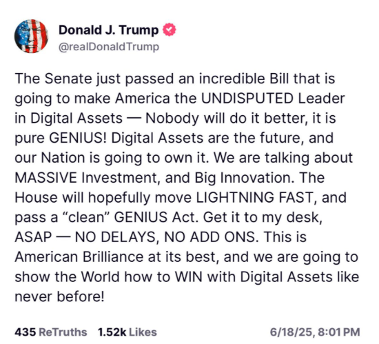 Prezident Trump oslavuje prijatie tohto zákona a tvrdí, že z Ameriky urobí nespochybniteľného lídra v sektore digitálnych aktív. Zákon podľa neho prinesie masívne investície a množstvo inovácií.