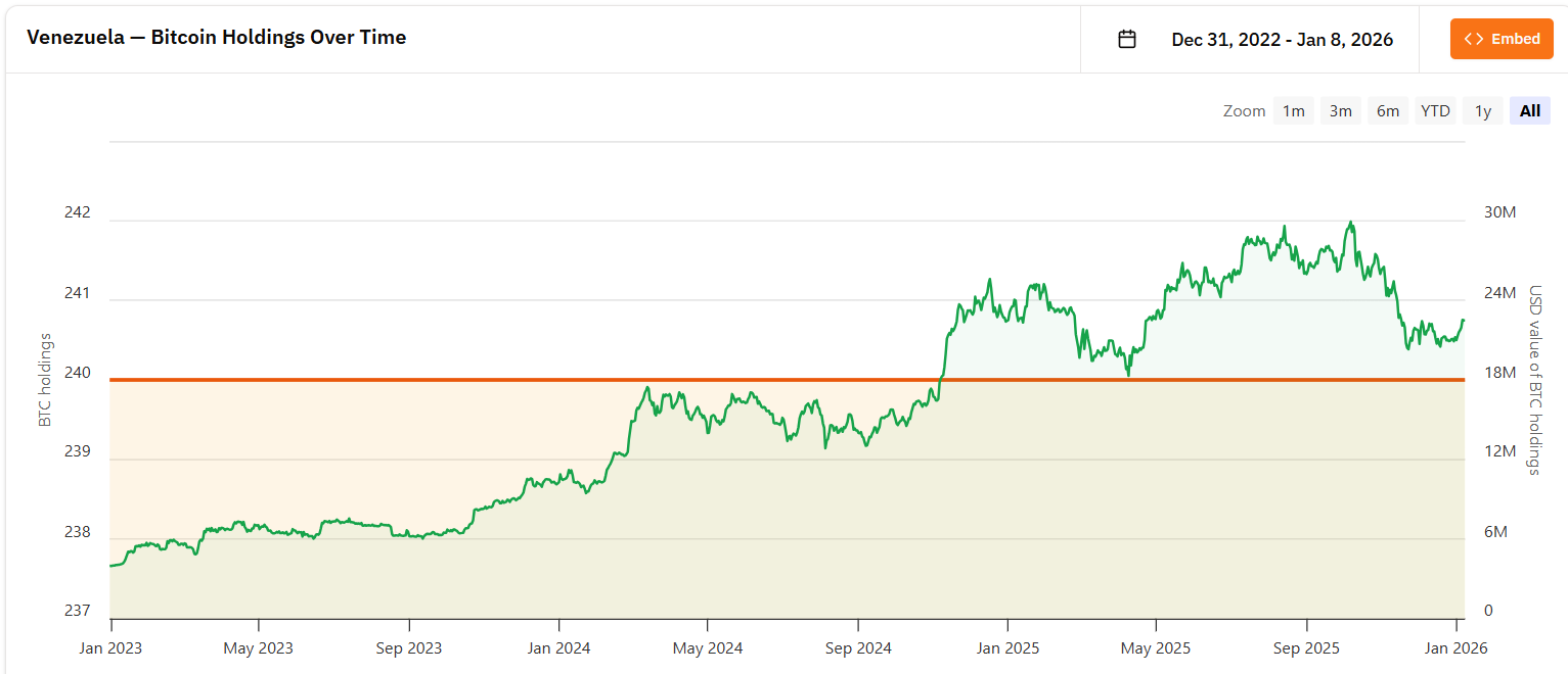 Bitcoin a rezervy Venezuely. Zdroj: bitcointreasuries.net