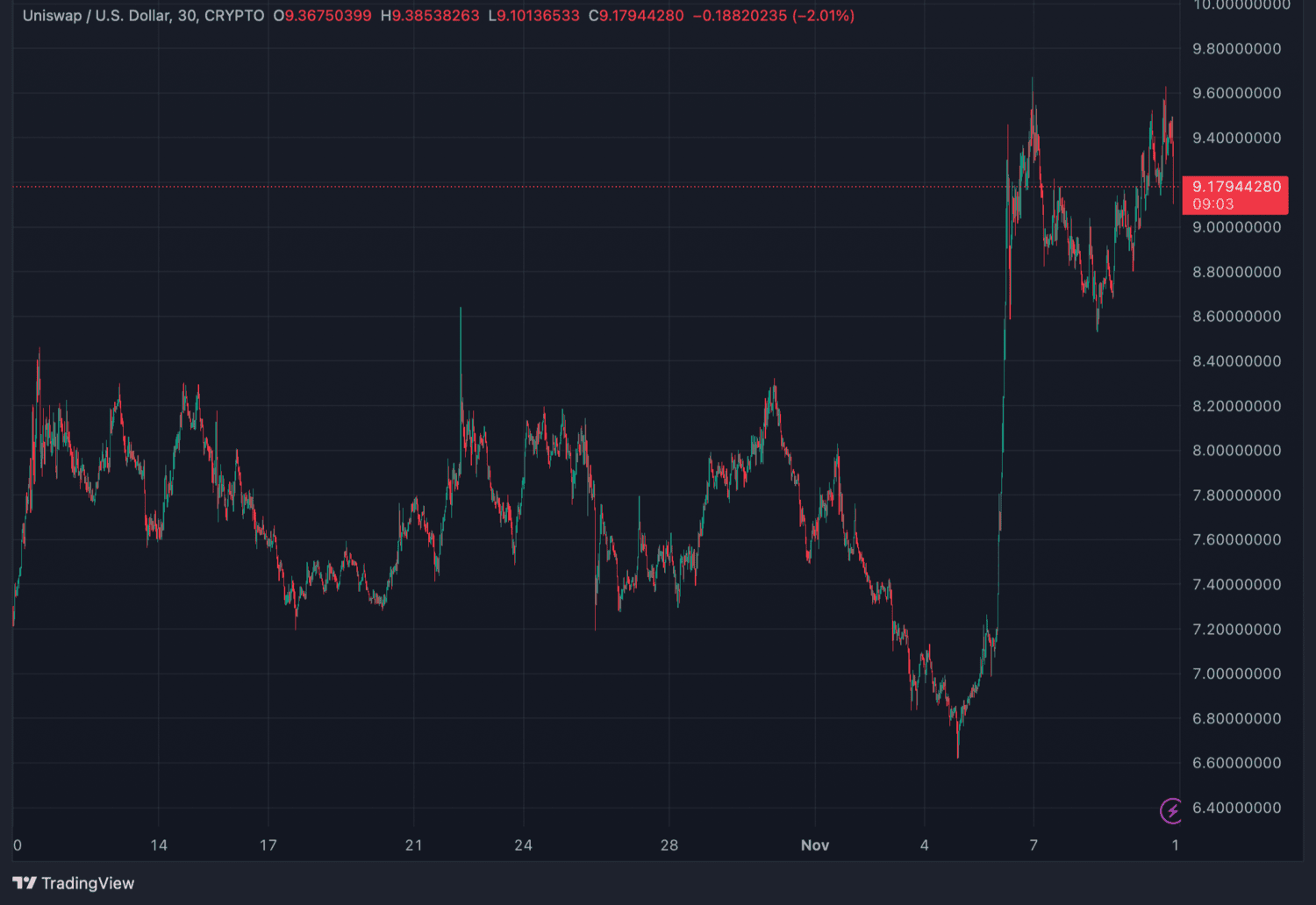 Uniswap je vedúca decentralizovaná burza na blockchaine Ethereum. Umožňuje používateľom obchodovať s tokenmi bez knihy objednávok pomocou automatizovaného protokolu likvidity. To dáva používateľom plnú kontrolu nad ich prostriedkami. Token UNI umožňuje držiteľom hlasovať o vývoji platformy, ako sú štruktúry poplatkov a distribúcia tokenov. Na podporu lojality Uniswap distribuoval 150 miliónov tokenov UNI minulým používateľom. Každý dostal 400 tokenov UNI v hodnote viac ako 1 000 dolárov pri spustení. Uniswap je open-source a umožňuje bezplatné listovanie tokenov. Tým sa odlišuje od centralizovaných búrz zameraním sa na prístupnosť a bezpečnosť. Radí sa medzi najväčšie DeFi platformy s aktívami presahujúcimi 3 miliardy dolárov.