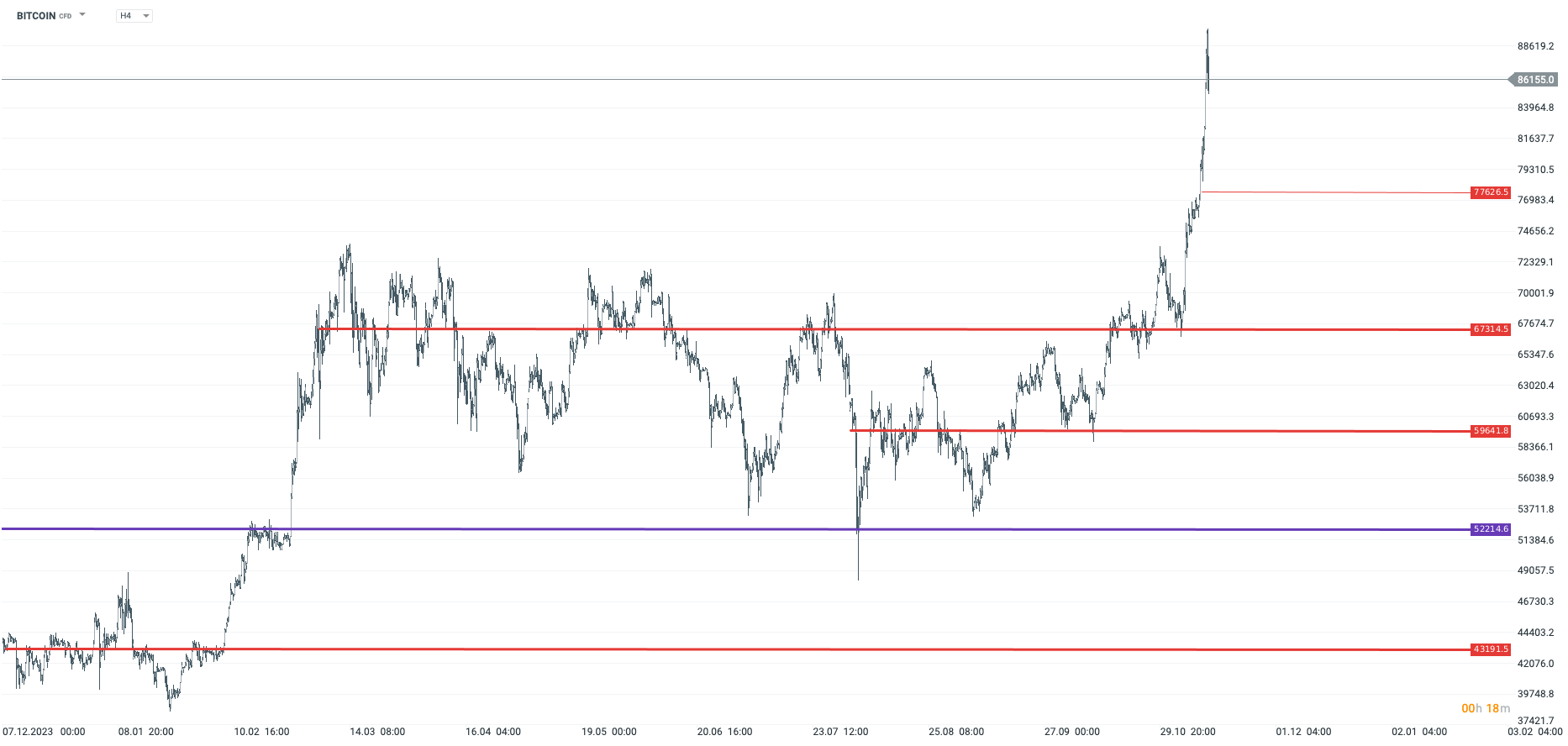 Kritickou hranicou pre udržanie rastového trendu je 77 620 USD, čo už v minulosti vyvolalo silný rastový impulz smerom k historickým maximám. Medzi ďalšie dôležité zóny patrí napríklad: