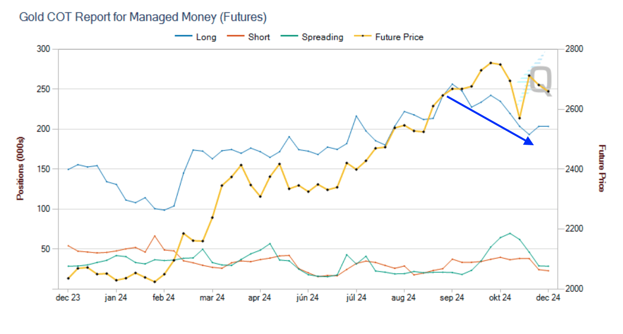 Na grafe nižšie vidíme postupné uzatváranie dlhých pozícií (modrá čiara) skupinou obchodníkov s futures, ktorá tiež začína sledovať cenový trend (žltá čiara). Z historického hľadiska ide o odľahlé hodnoty z hľadiska čistých dlhých kontraktov a práve takéto úrovne môžu naznačovať možný obrat súčasného trendu, nehovoriac o tom, že zlato si v roku 2024 viedlo veľmi dobre a prekonalo dokonca aj niektoré akciové indexy.