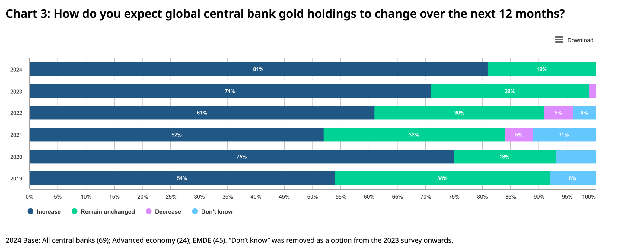 Podľa prieskumu o zlatých rezervách centrálnych bánk (CBGR) na rok 2024 má 29 % respondentov z centrálnych bánk v úmysle zvýšiť svoje zlaté rezervy počas nasledujúcich 12 mesiacov, čo je najvyššia úroveň od začiatku prieskumu v roku 2018. Nákupy sú motivované predovšetkým snahou o obnovenie strategickej úrovne držby zlata, obavami o finančné trhy vrátane vyšších rizík spojených s krízou a infláciou.