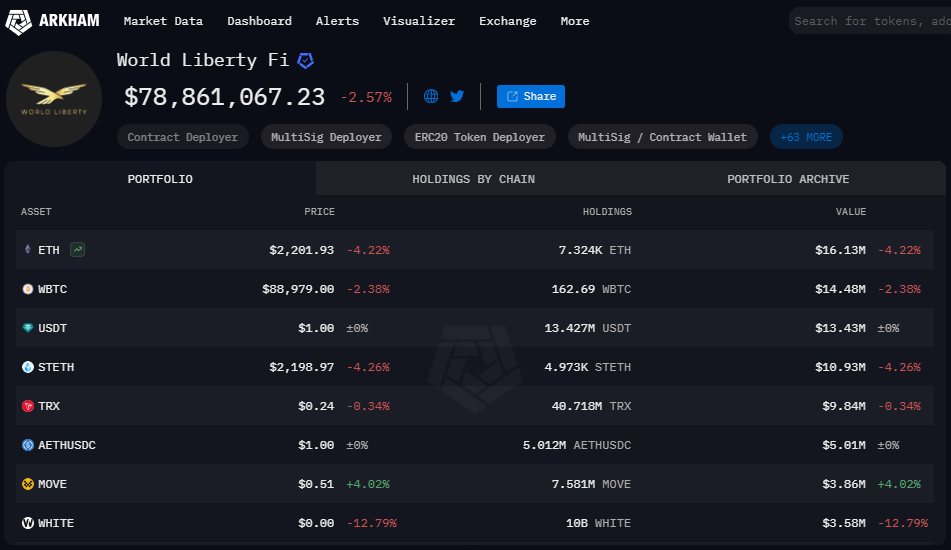 Kryptomenové portfólio WLFI. Zdroj: intel.arkm.com